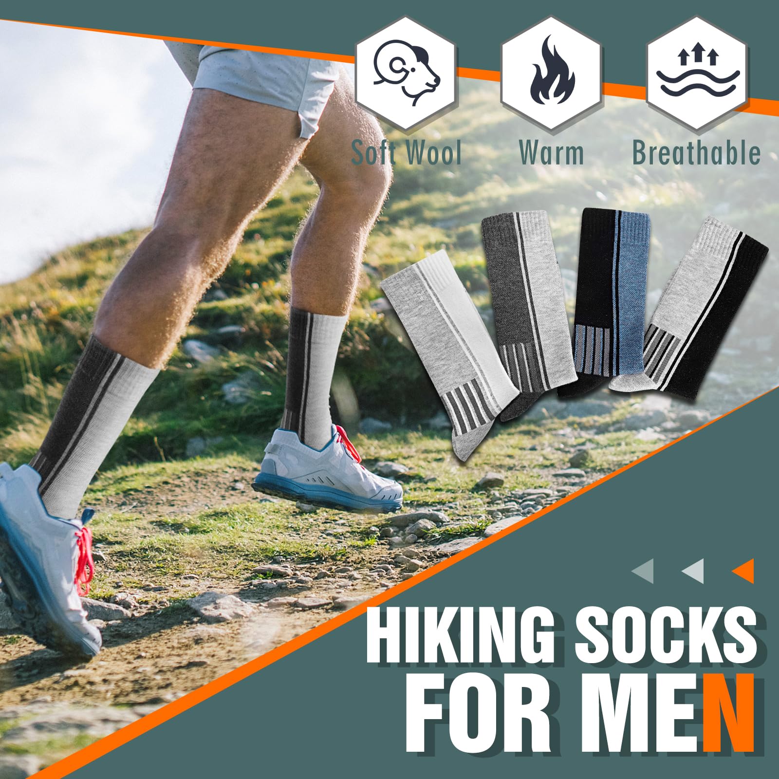 - 【Package and Size】Here are 4 pairs men merino wool hiking socks , one size fits most men, The value package with fashion design are most men’s favorite.