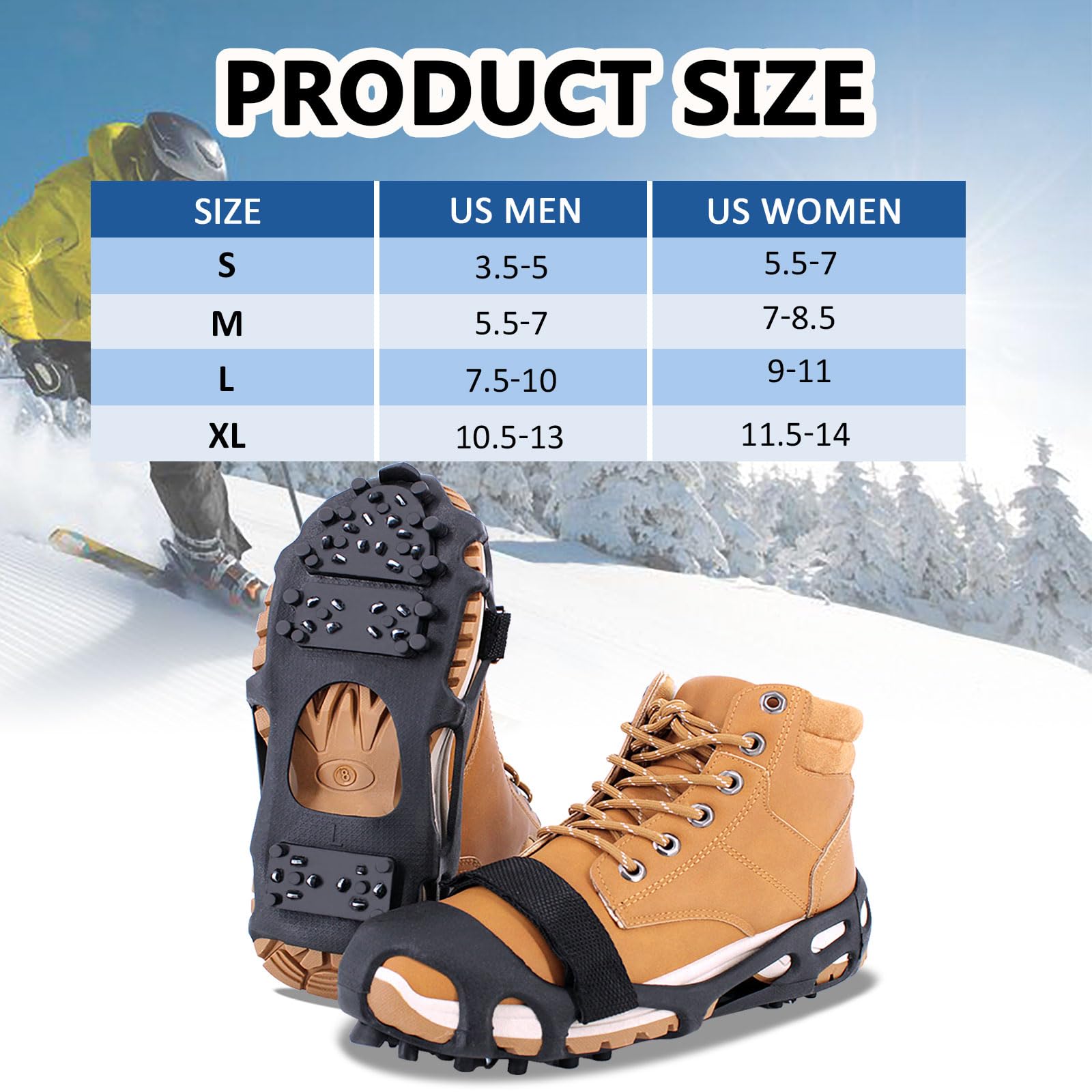 - 【WIDELY USED】Our spikes are perfect for angled terrain,ice roads,icy driveway,heavy snow,ice river,freezing ground,freezing mud,cement,wet grass,snow shoveling,ice fishing,hiking/hike,trek,exploring,hunting,jogging,trail running/run,walking in poor winter conditions,outdoor activities,allowing you to access and enjoy your favorite destinations.Hiking spikes for shoes,mountaineering & ice climbing crampons for hiking boots women,crampons for hiking boots men,winter walking ice cleats