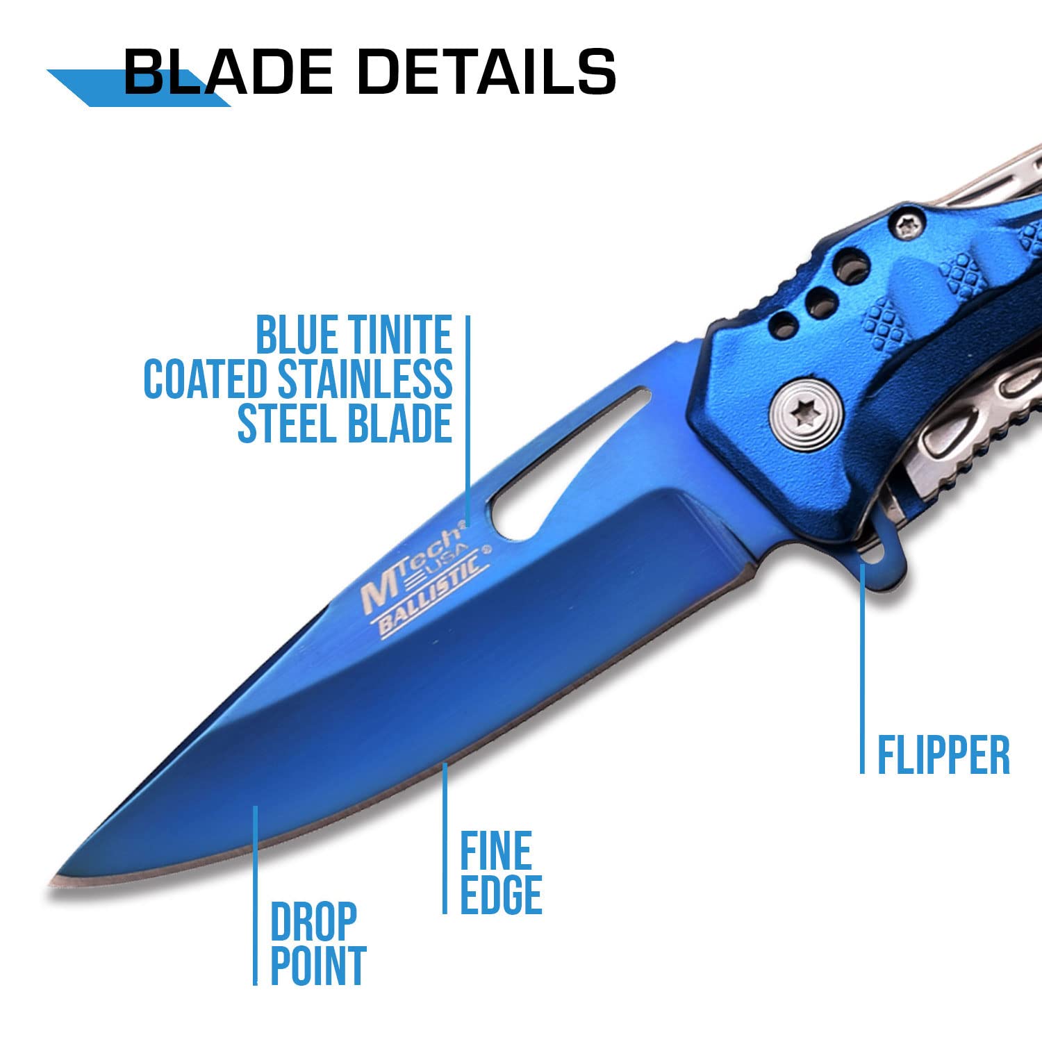 MTech USA – Spring Assisted Folding Knife – Blue TiNite Coated Fine Edge Stainless Steel Blade, Blue Aluminum Handle, Pocket Clip, Tactical, EDC, Self Defense- MT-A705SBL,Blue/Silver