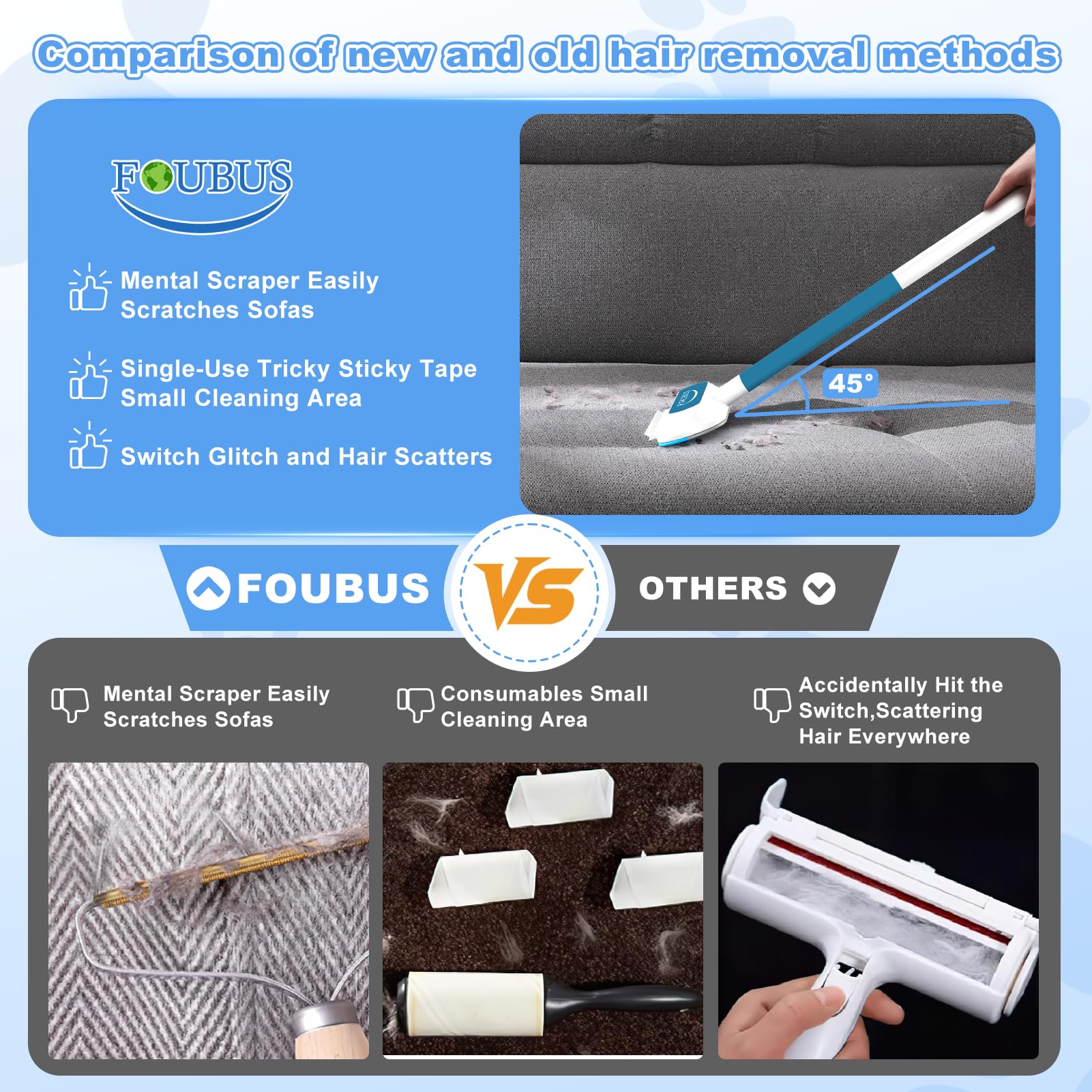 - 🐈Good For Your Pet's Body🐾Pets often lick household items that are similar in texture to fur which can cause your pet to vomit frequently. Whether it's dry debris or wet spills, FOUBUS animal hair remover handles it all. Unlike traditional sticky rollers & lint brush, FOUBUS pet fur remover leaves no traces of glue behind,regularly clean all areas of your home of dust and fur, ensuring a clean and safe environment for your pets and family. Say goodbye to metal strips scratching fabrics.