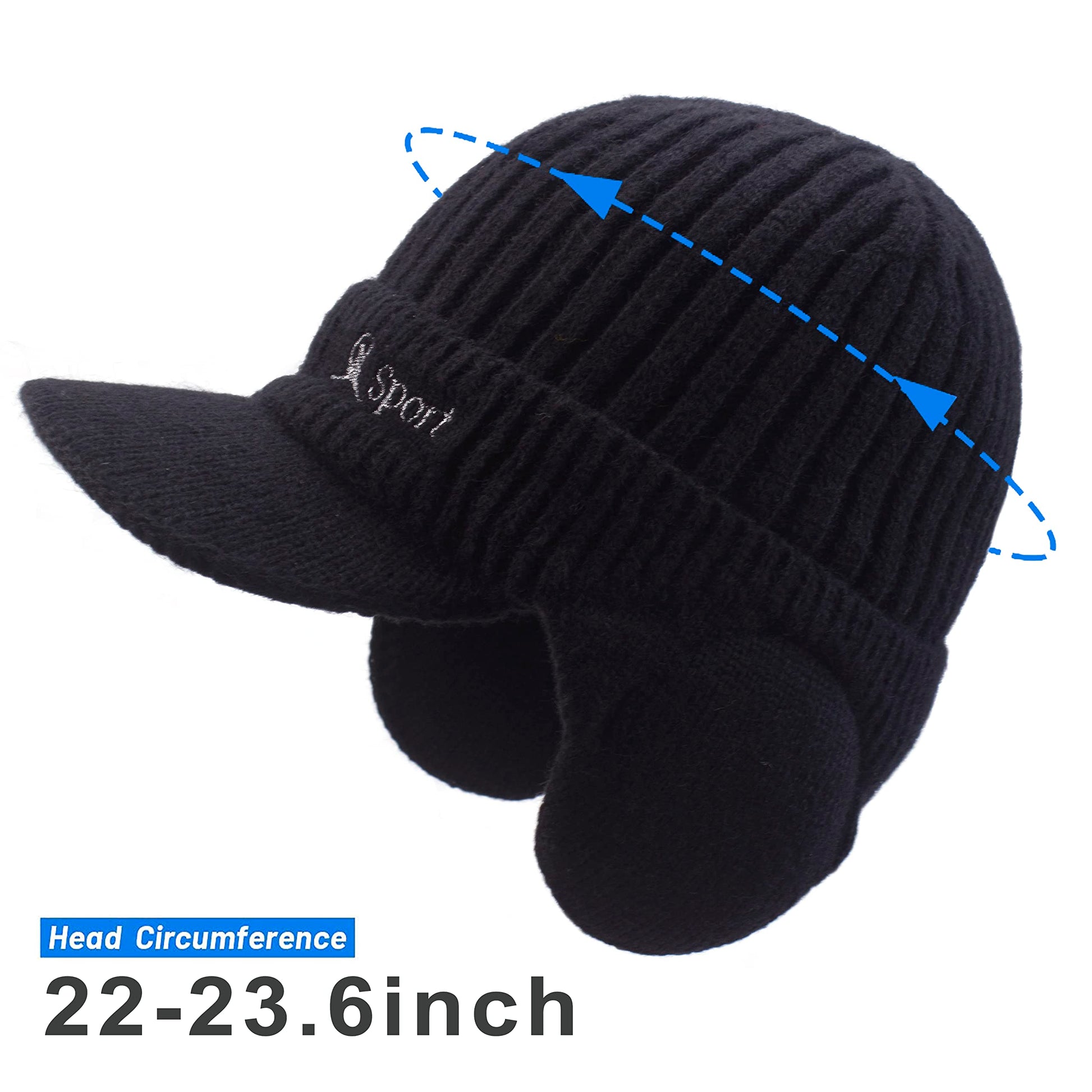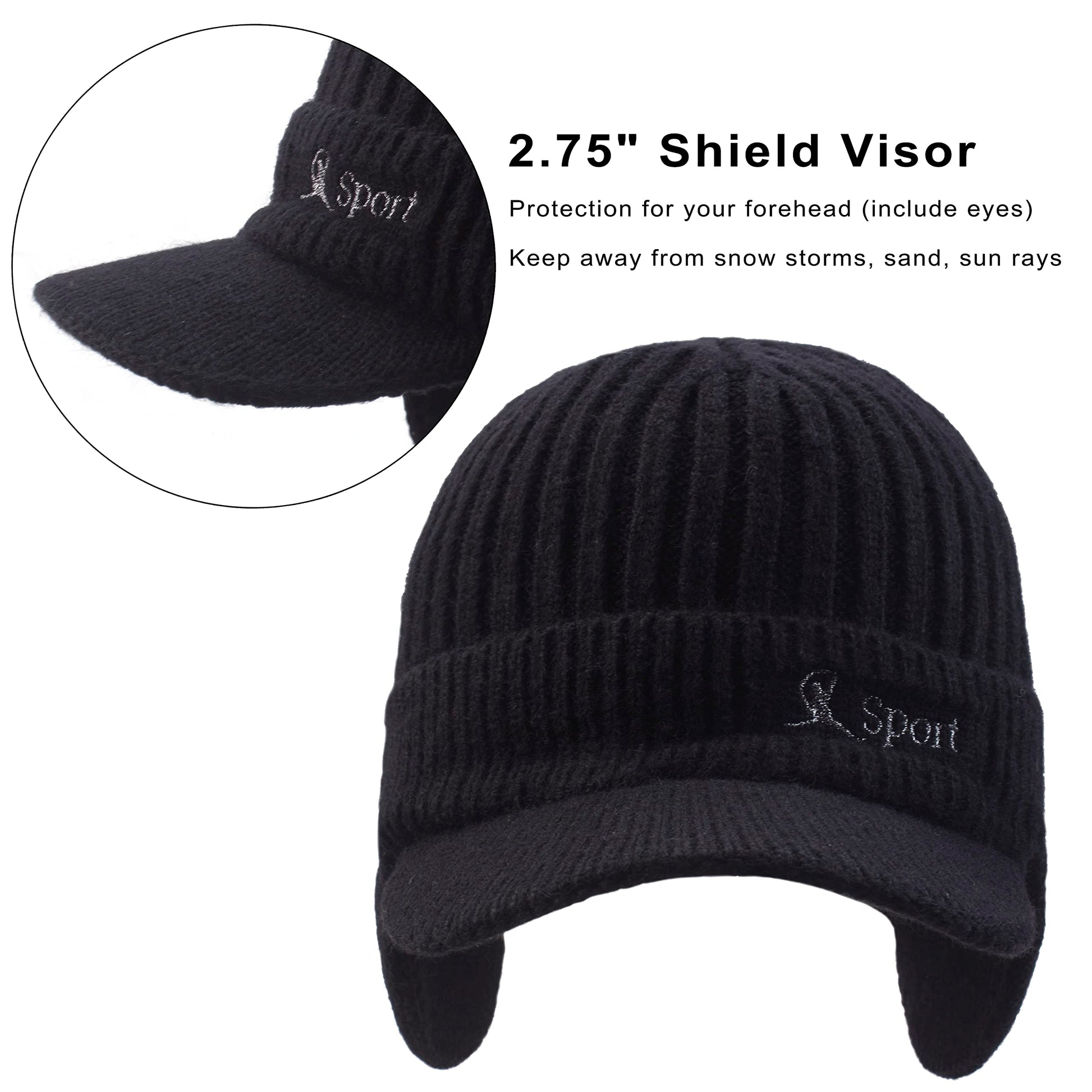 - Design: This men knit hats come with earflaps, which can wrap your ears and cheeks nicely, providing maximum protection for your ears and head in winter. 2.75'' sturdy and durable brim prevents the sunlight, snow and rain out of the eyes and faces very nicely. In addition, the folded edge design makes the forehead and ears warmer and more comfortable.