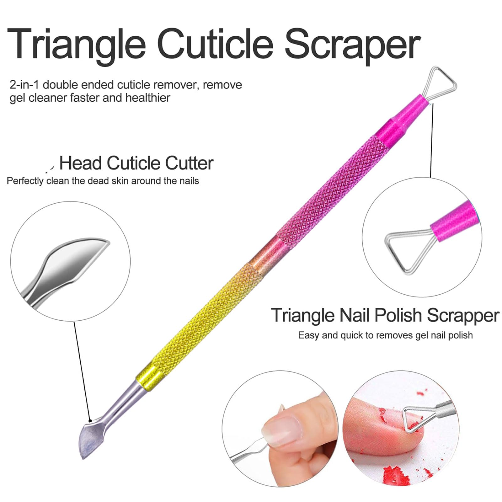 - Durable and Ergonomic Nail Cuticle Pusher:This quick gel nail polish remover comes a stainless steel triangle cuticle peeler scraper remover tool,the curved end is designed to match the normal curvature of the nail, great design makes it more thorough removal of nail polish on the corner.Double head design to meet different needs.Better and more convenient to remove nail polish