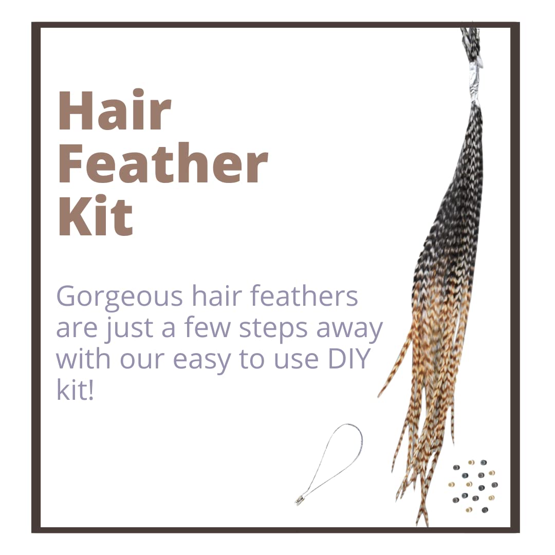 Natural Hair Feathers, Real Long Feather Hair Extensions with bead loop kit, 20 Long Thin Tie Dye Ginger Brown and Black and White grizzly striped Ombre Bayalage Plumes