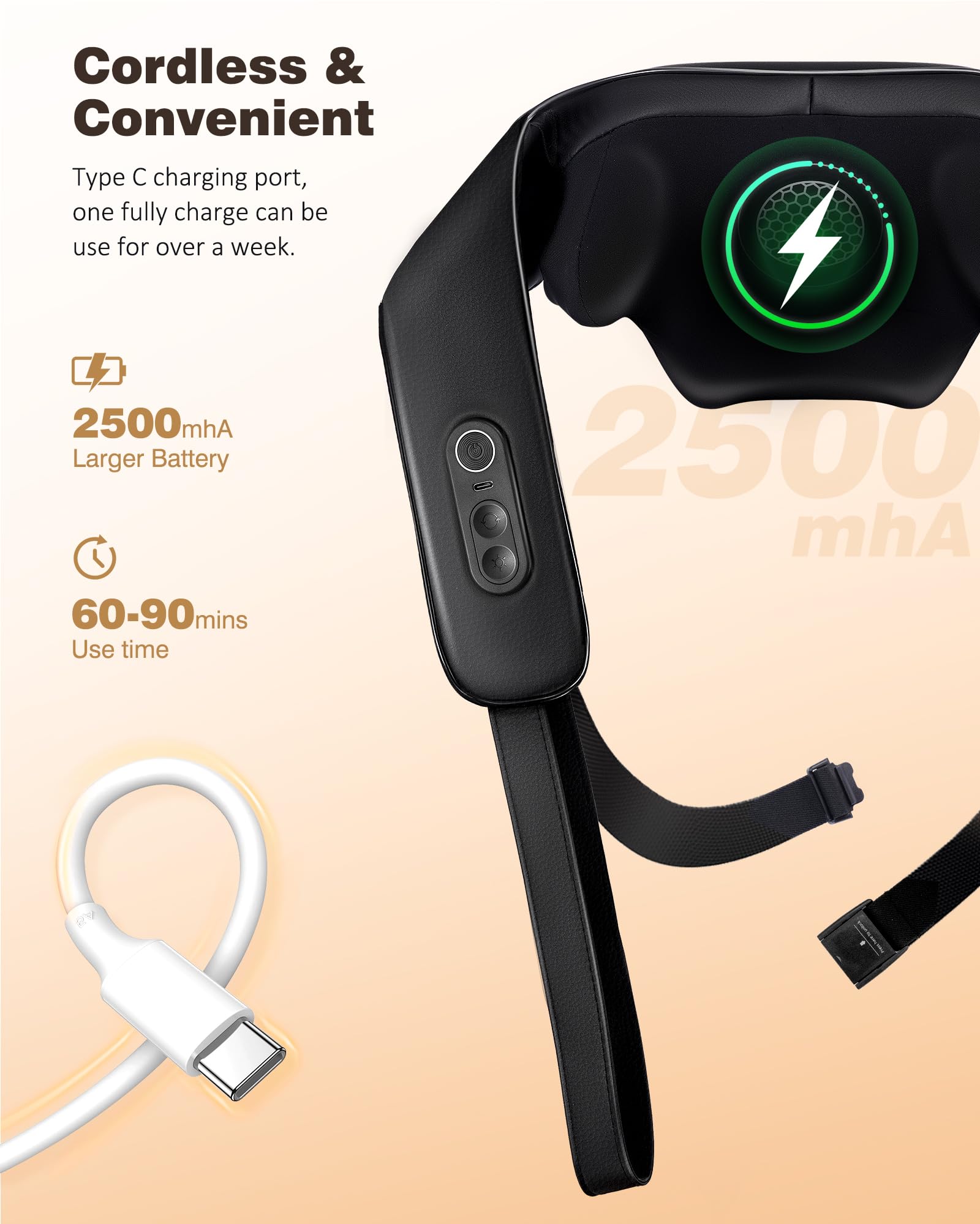 - Long-Lasting Capacity Battery: This neck and back massager with heat has a built-in 2500mAh large-capacity battery, which takes about 3.5 hours to charge. Equipped with a Type C charging line, a fully charge can provide about 60-90 minutes of relaxing massage, which can last over a week with 10minutes use per day.