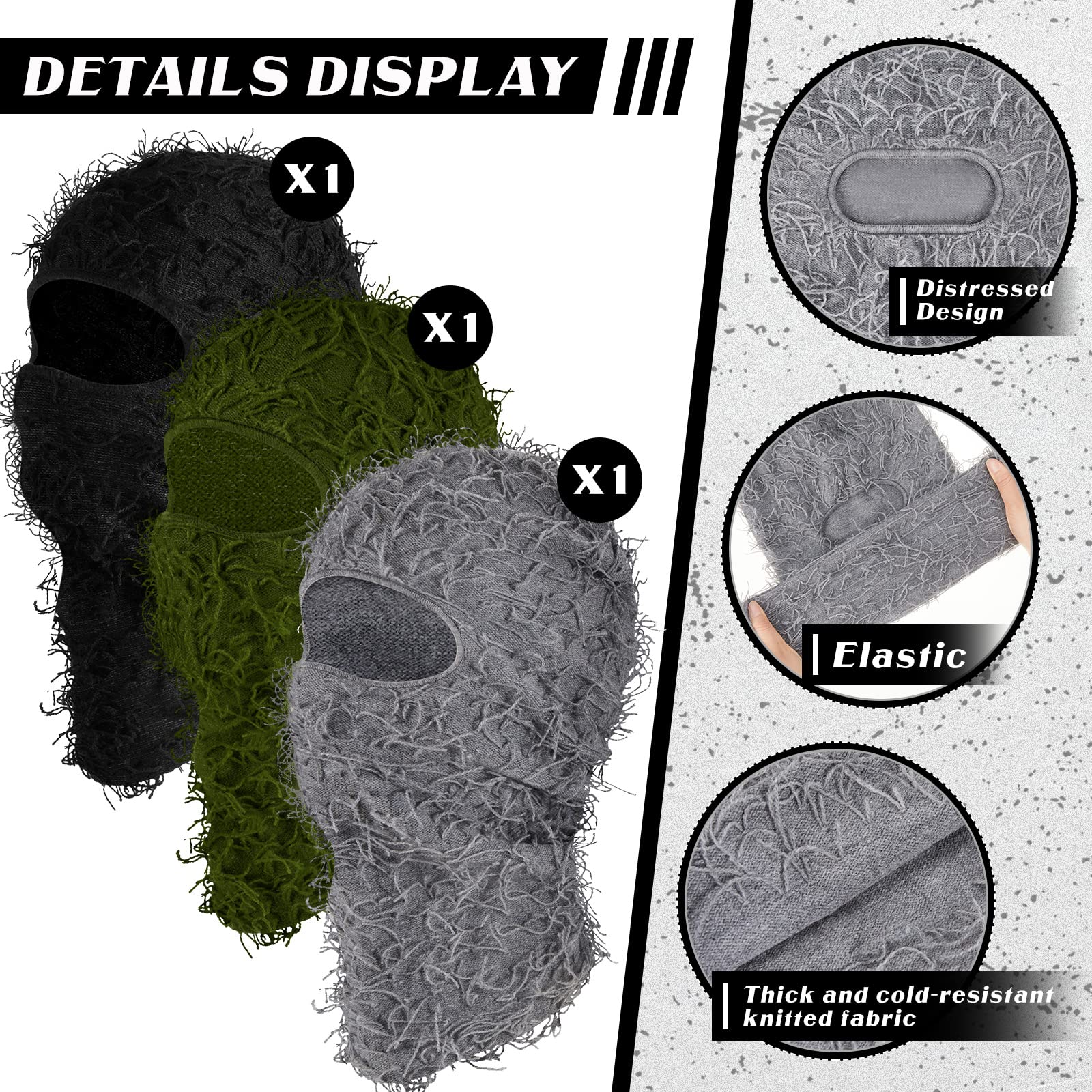 Newcotte 3 Pcs Distressed Balaclava Full Face Ski Mask Cool Knitted Balaclava Windproof Ski Mask for Men Women Cold Weather (Black, Dark Gray, Army Green)