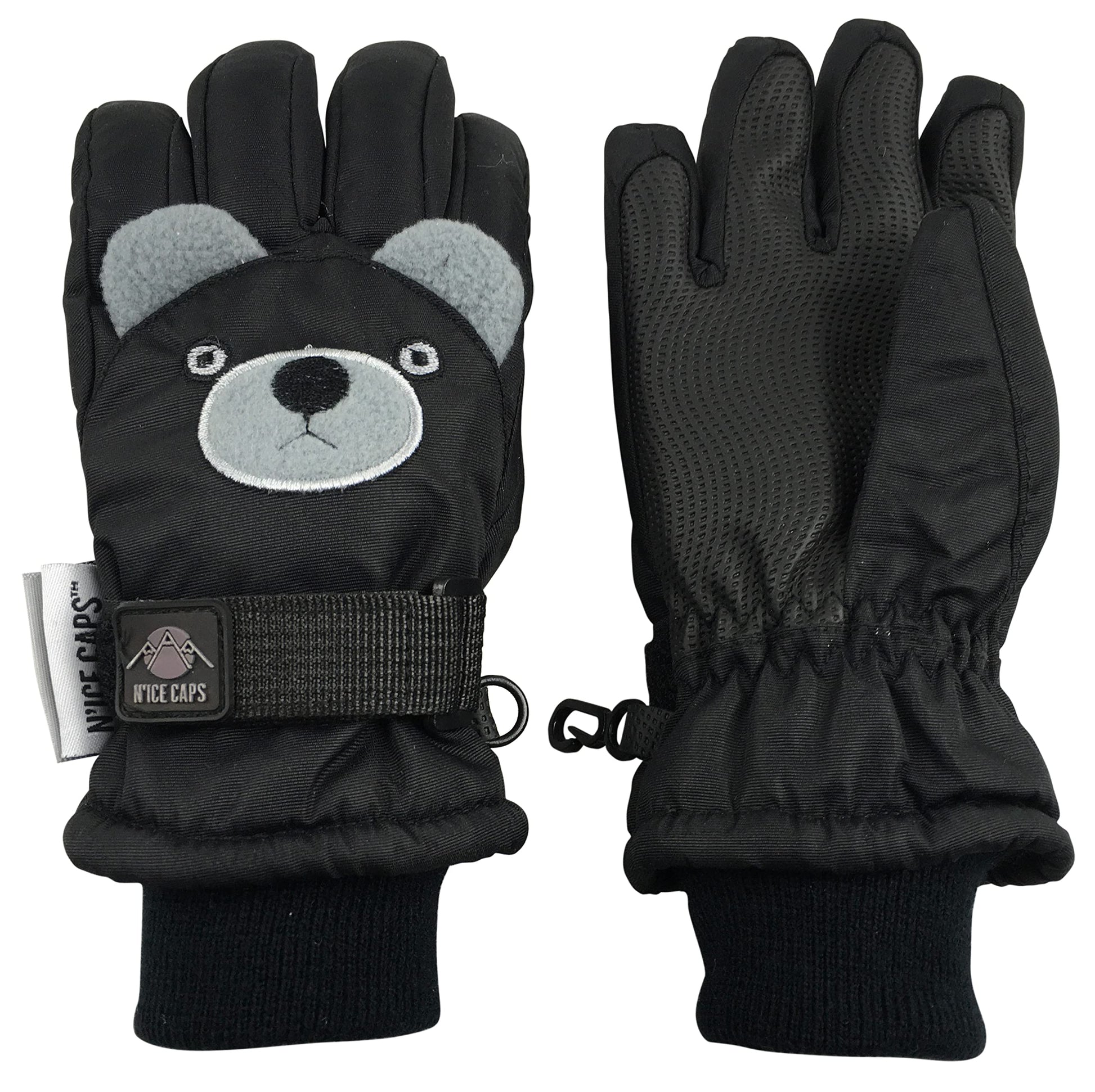 Details: N'Ice Caps Kids Waterproof Snow Cute Animals Gloves Warm Winter Thinsulate for Boys, Girls, Children, Youth and Toddlers. Gloves have 3M Thinsulate insulation and waterproof lining, great for cold temperatures and staying dry in wet or snowy conditions. Full PU sure gripper on palms, fingers and thumbs, and nubuck reinforced thumbs to provide grip for outdoors . Gloves have elastic under glove wrists for easy-on wear, and knit cuffs. Size recommendations and product dimensions (Dimensions: Length is measured from the elastic along the wrist of the glove to the end of the middle glove finger; Width is measured across the palm area of the glove at the widest point) : 3-4 Years (5.25' length, 3.5' width); 5-6 Years (5.75' length, 3.75' width); 7-8 Years (6.0' length, 4.0' width), 9-10 Years (6.5' length, 4.25' width), 10-12 Years (6.75' length, 4.35' width). Available in lots of colorful print options for boys and girls.