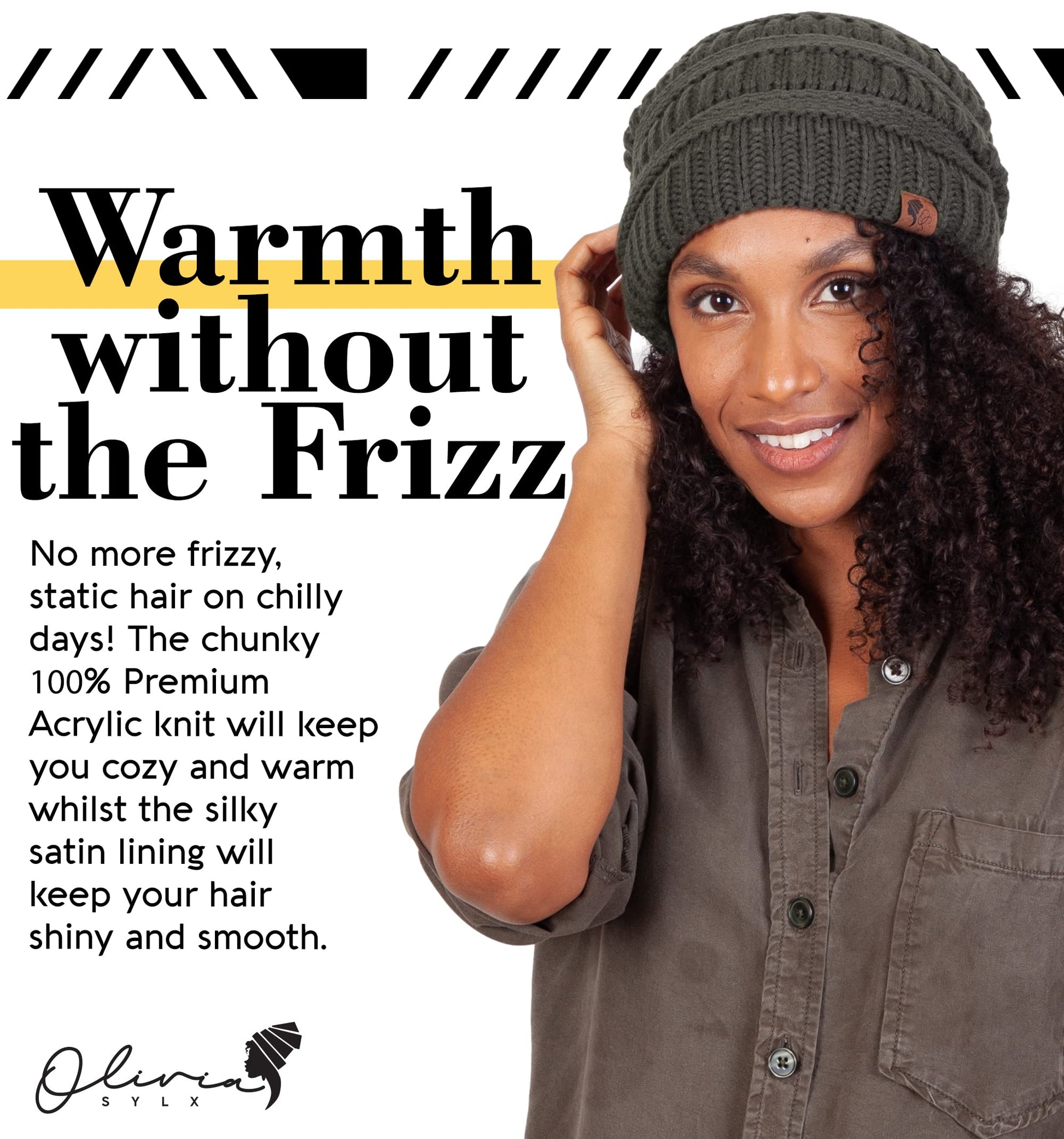 Details: Made with a premium satin liner and acrylic outer, our satin lined beanie for natural black hair is the perfect way to stay cozy and stylish all fall and winter long. We've designed for women a chunky beanie that looks great AND protects hair. The slouchy fit is custom built to ensure all of your hair (even if you have a lot of it) can fit into our satin lining hats. The silky-smooth, premium high thread count satin in our lined slouch beanie prevents frizz and breakages by locking in moisture to keep hair from damage caused by dryness. Satin was chosen over silk because of the breathability satin offers to protect hair better. By lining our chunky beanies to 1.25' from the hem, we've ensured the lining will cover (and protect) all of your hairs, even the very front and baby hairs. Custom sized & designed to look great on women of any head size or shape, our satin lined beanie for natural black hair will comfortably (and snugly) fit almost any head and hair types thanks to the gentle stretch in the knit. This hat has been styled and tested to deliver a flattering look to all head shapes and sizes.