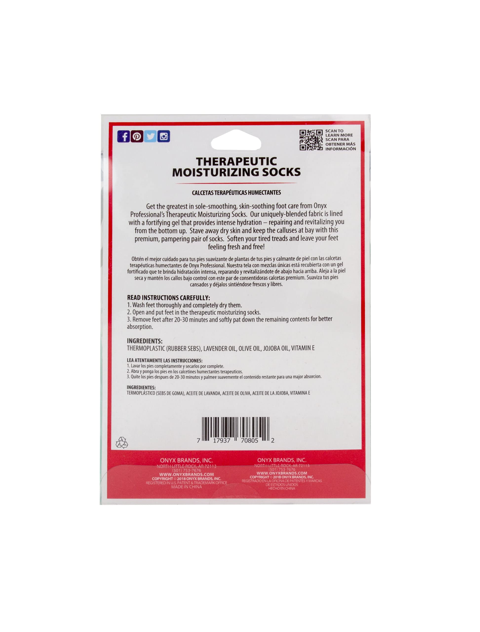 Details: Onyx Professional Gel Infused Moisturizing Socks for Dry Feet Treat yourself to a spa-like foot therapy with our Reusable Moisturizing Gel Socks that can be used up to 50 times. Enriched with Vitamin E and nourishing oils like lavender, olive and jojoba, they soften heels, calluses and rough skin. Rejuvenate your feet with intense moisture, thanks to the gel-infused soothing lining that embraces your feet in comfort. The unique blend of fabric, combined with the fortifying gel, ensures total foot coverage, providing an ultra-comfy experience. Stave away dry skin and keep the calluses at bay with the premium, pampering pair of socks that soften your tired treads and leave your feet feeling fresh. Simply wash your feet and ensure they are dry before slipping into these socks. After 20-30 minutes, gently massage any moisture into your skin for better absorption Onyx is a self care brand committed to making your routine a bit more fun. We make high quality products in a wide variety of categories such as nail polish removers, nail strengthening, foot care, body scrubs and bath bombs. Marsha Martin, our CEO, founded the company 30 years ago. Her passion for beauty along with a Cosmetology license led her down a path of innovating affordable, on trend beauty and self care products. All of our products are cruelty free and made with premium ingredients and materials.