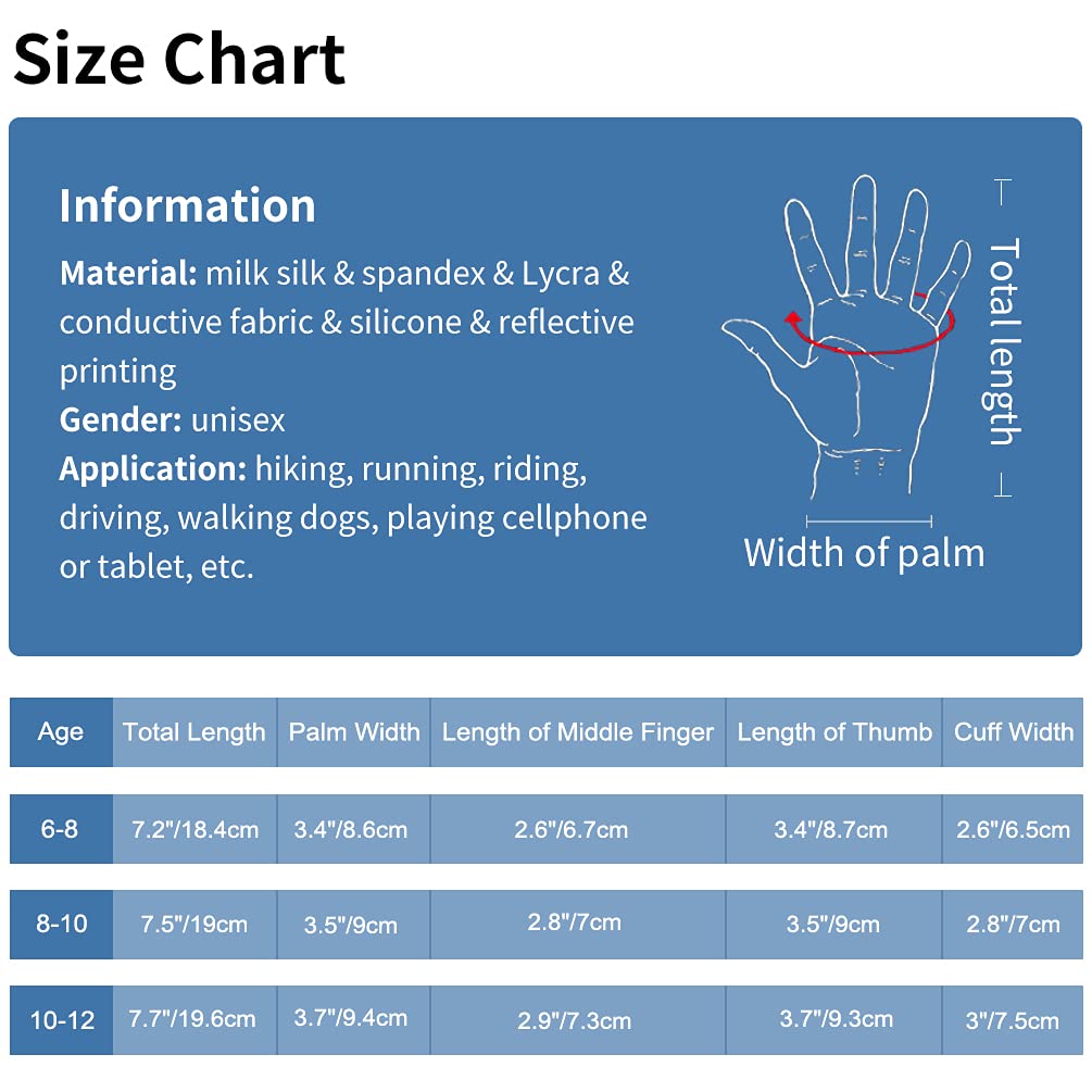 - About Size - These kids winter gloves are suitable for kids between 6-12 years old. Please use the size chart on the picture to choose. These gloves for kids are perfect for indoor and outdoor activities, such as using smartphones, walking, cycling, running, and jogging.