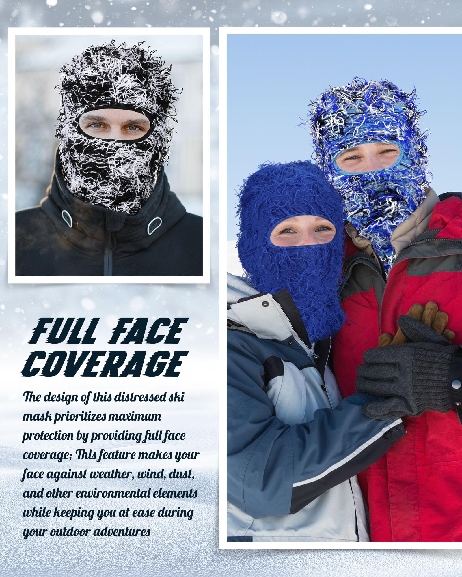- Full Face Coverage: the design of this distressed ski mask prioritizes maximum protection by providing full face coverage; This feature makes your face against weather, wind, dust, and other environmental elements while keeping you at ease during your outdoor adventures