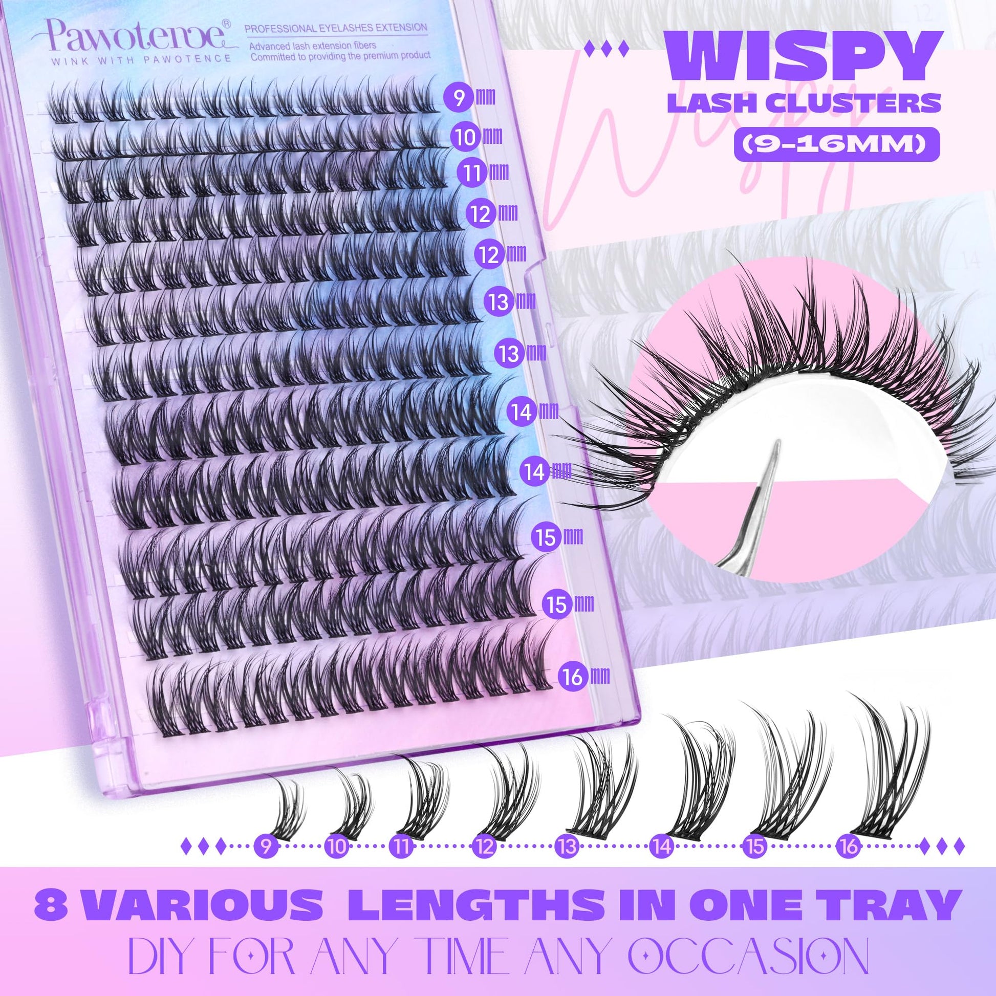 Pawotence Lash Clusters Wispy 9-16mm Individual Lashes Cluster Eyelash Extensions 192pcs Lash Extension DIY Soft Natural Eyelash Clusters with Thin Band