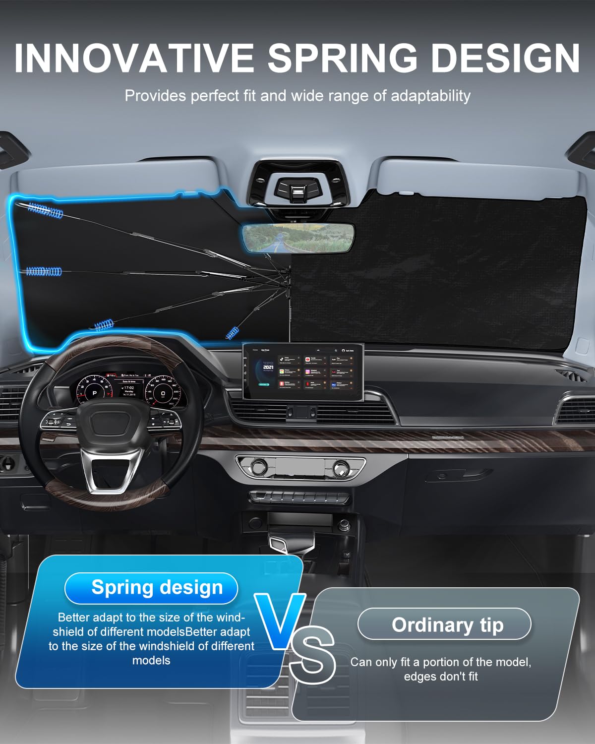- 【How to use and after-sales service】 1. Open the car sunshades for windshield parasol like a normal umbrella. 2. Turn the white side outward and install the sunshade for car windshield parasol on the windshield. 3. Stick the adhesive tape on the rearview mirror opening, then lower the main and co-pilot sun visors and fix them. If you have any questions after purchasing the sunshade for car windshield parasol. We will answer your questions 24 hours a day.