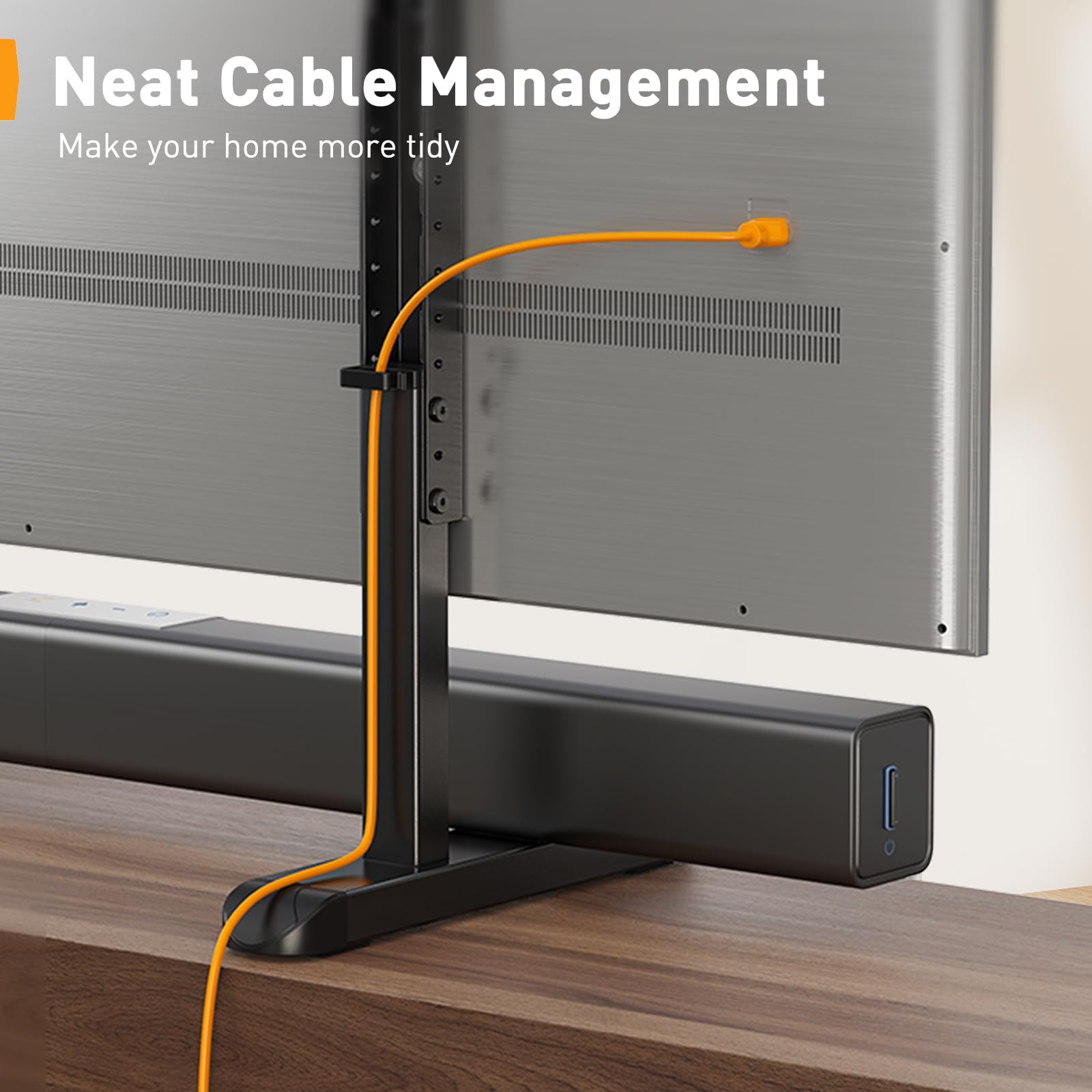 - 【Wire Management Design-Provide a Cleaner Desktop】The Wire clips help to manage cables for a neater, cleaner-looking living space And the table top tv stand is specially designed with soundbar isolation pads to minimize soundbar vibration and enhance stability for better sound.