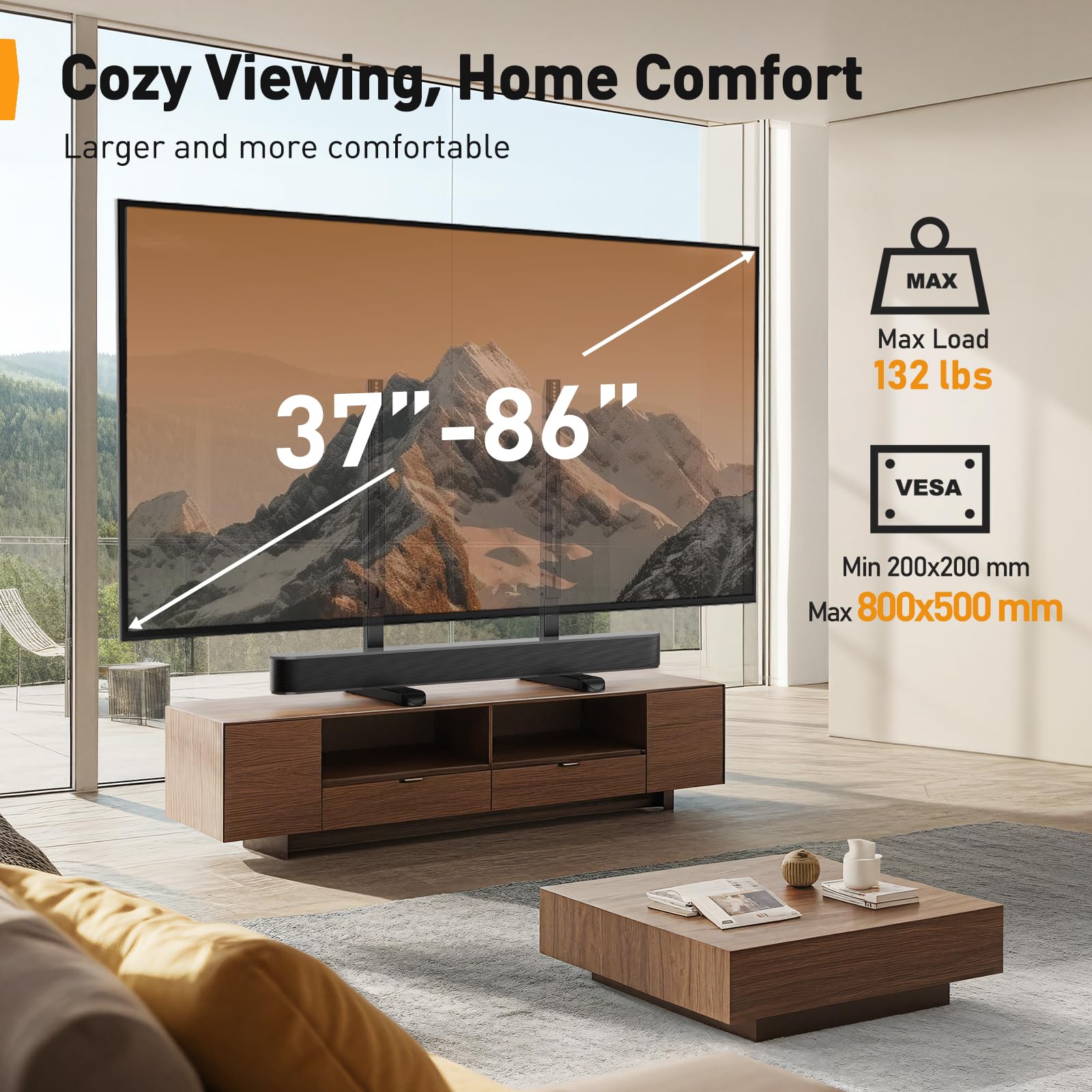 - 【Maximum Load Capacity is 132 lbs-Ensure More Security】The universal TV stand features 15″ heavy-duty reinforced steel feet and a support pillar to hold TVs up to 110 lbs. Anti-slip pads on the bottom of the TV stand legs enhance stability to ensure a wobble-free TV and a soundbar.