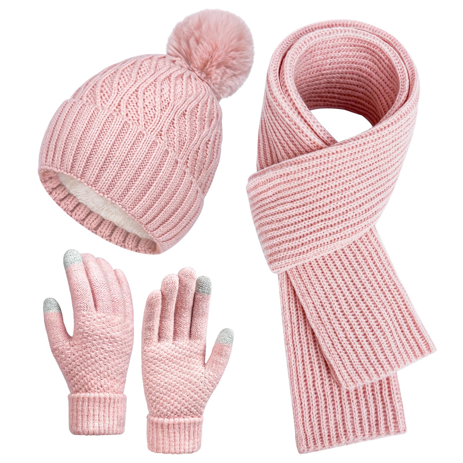 Pink Winter Knit Beanie Hat Scarf Gloves Set for Women, Fleece Lined Chunky Beanie Hats with Pom Pom Neck Warm Scarf Touchscreen Gloves 3 in 1 Set