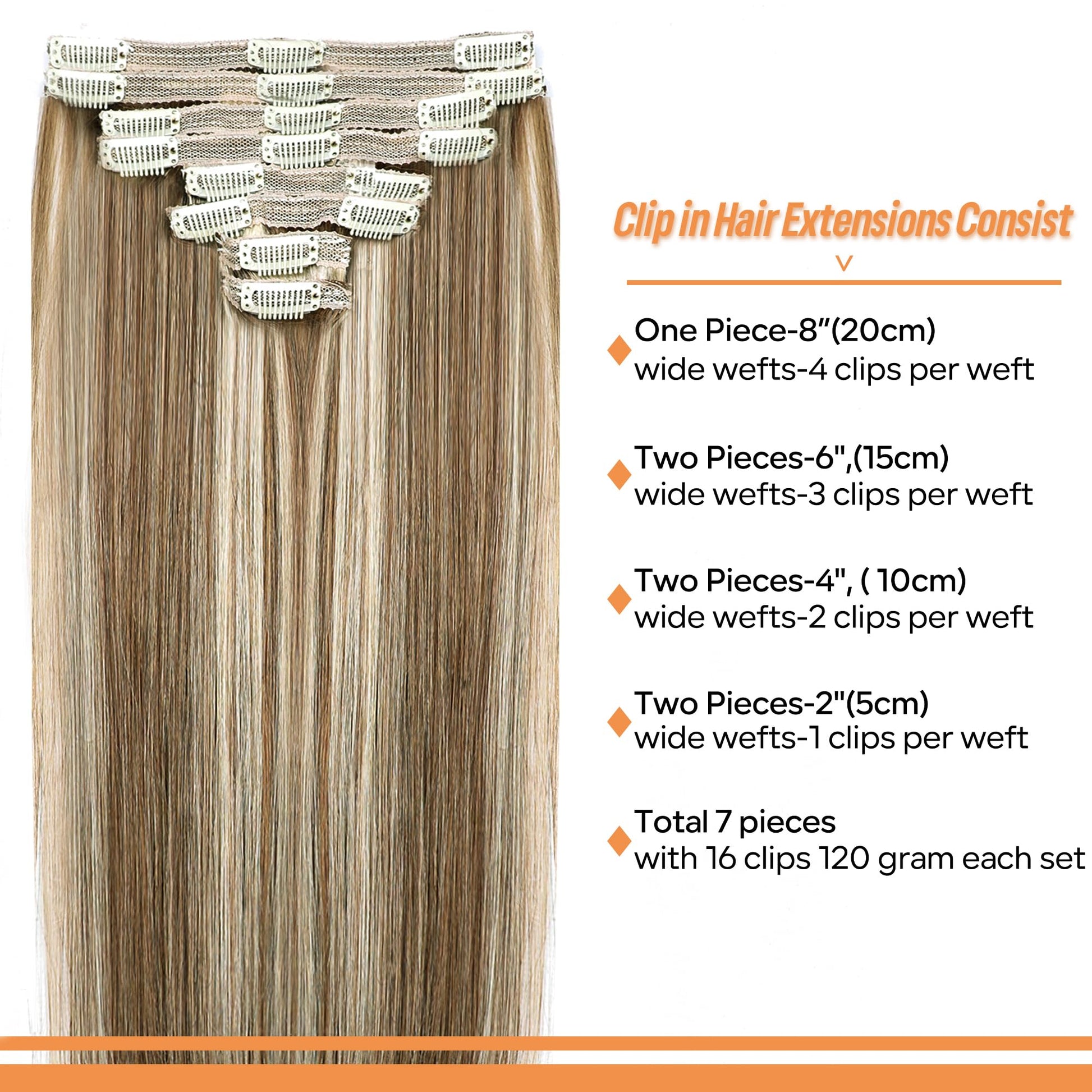 - 【A Set of 8 Piece & Tips】Pobokix clip in hair extensions real human hair , 8 pieces 120g with 18 clips per set. Usually 2 sets is recommended to make a full head to add hair length and volume, 3 sets are suggested if you want thicker