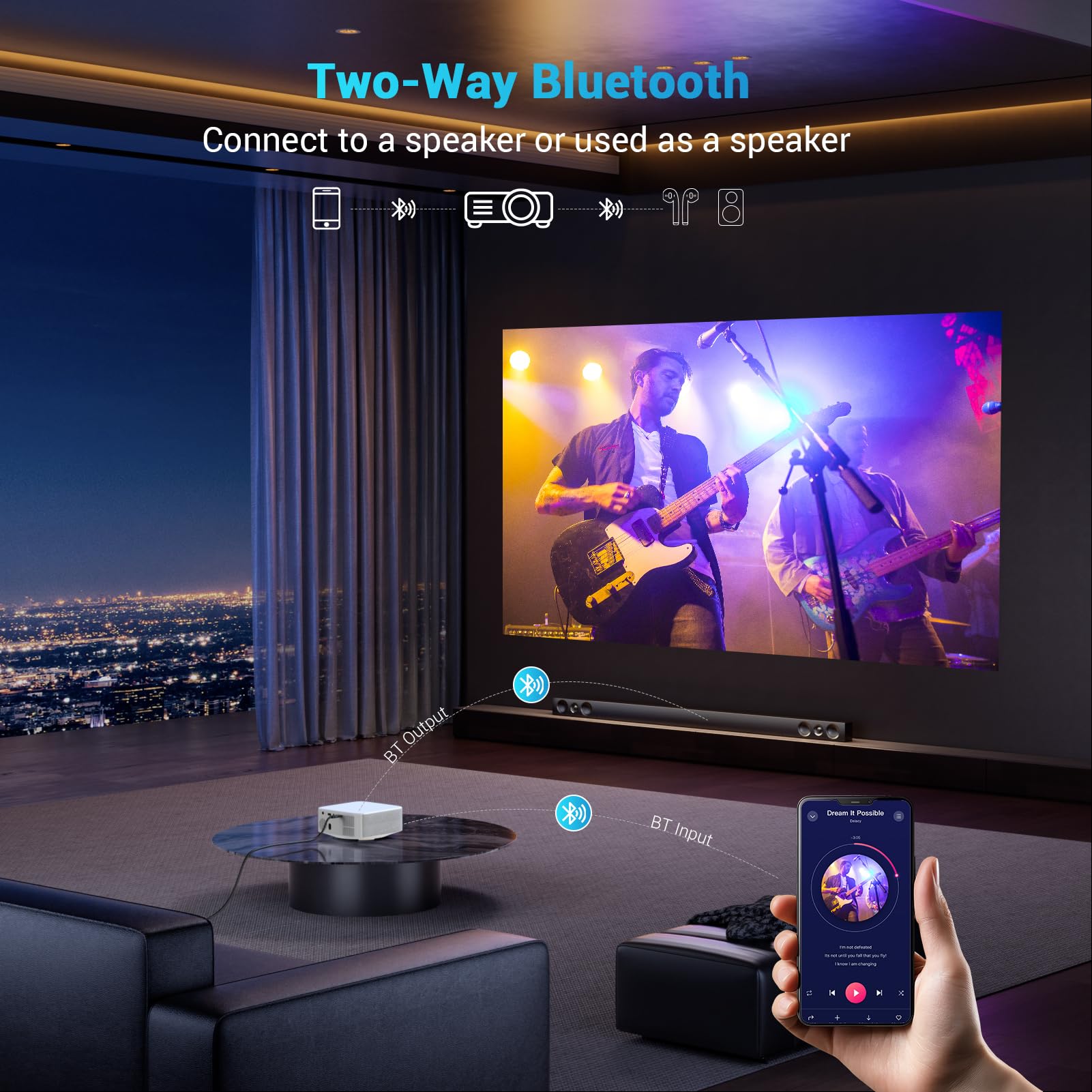 - [Latest Two - Way Bluetooth Projector ] This home projector comes with a built-in speaker, allowing you to indulge in a cinematic audio - experience without the need to connect external speakers. Its Bluetooth 5.1 enables fast, stable audio sync. With Bluetooth, you can freely connect your favorite speakers or headphones for better sound and truly build your very own home theater.