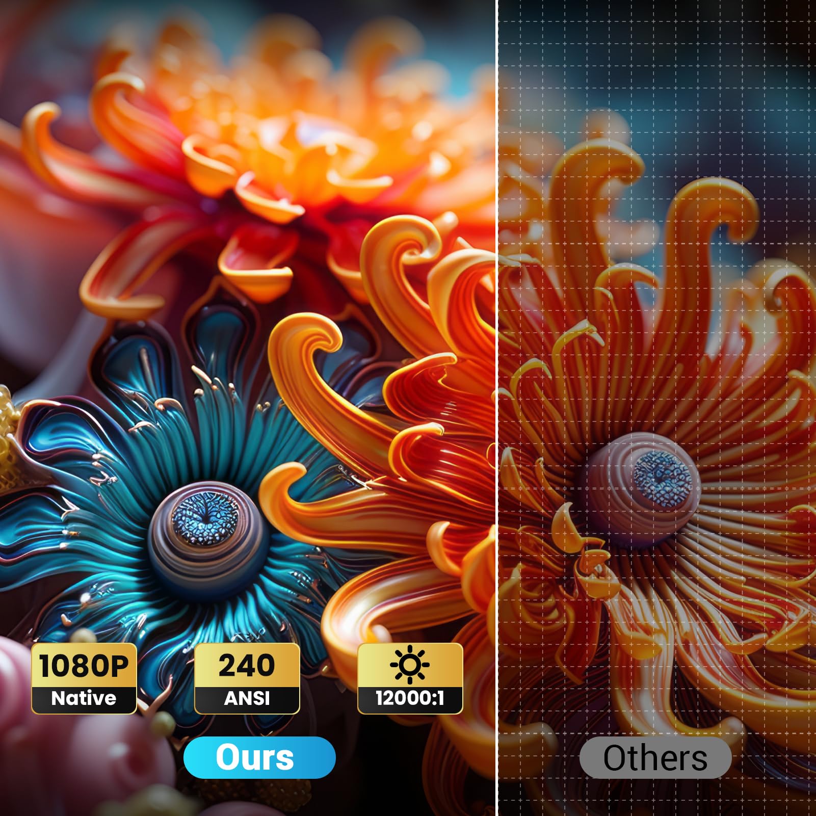 - [Full HD 1080P Movie Projector ] Featuring a crisp 1920x1080 resolution, this 1080p projector delivers sharp, vivid images for home theater use, business meetings, and gaming sessions. With 240 ANSI lumens, it produces bright visuals that maintain clarity even in moderate ambient light. These features combine to create a cinematic experience for every movie, presentation, or game.