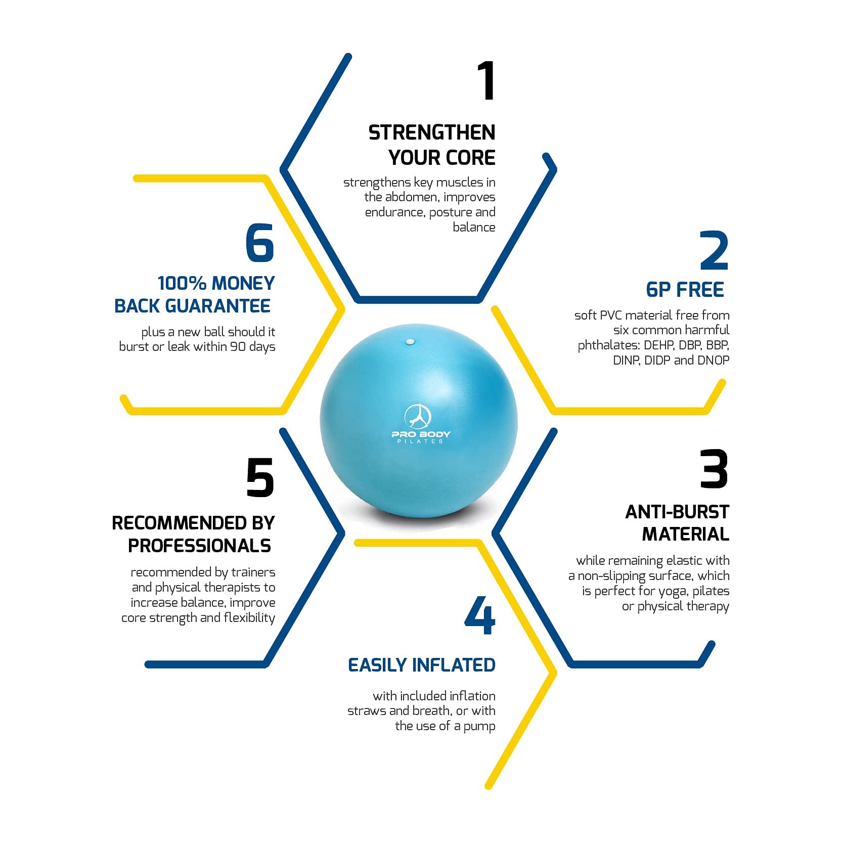 - INCLUDED with our small excersize balls are exercises and extra inflation straw. The exercise ball for Pilates is inflated in seconds and it's easy to bring the small ball for exercise on the run.