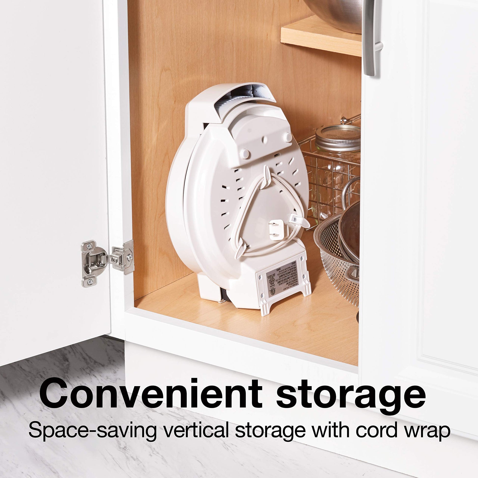 - SPACE-SAVING VERTICAL STORAGE The waffle cone maker stands up vertically for storage which saves space in the kitchen