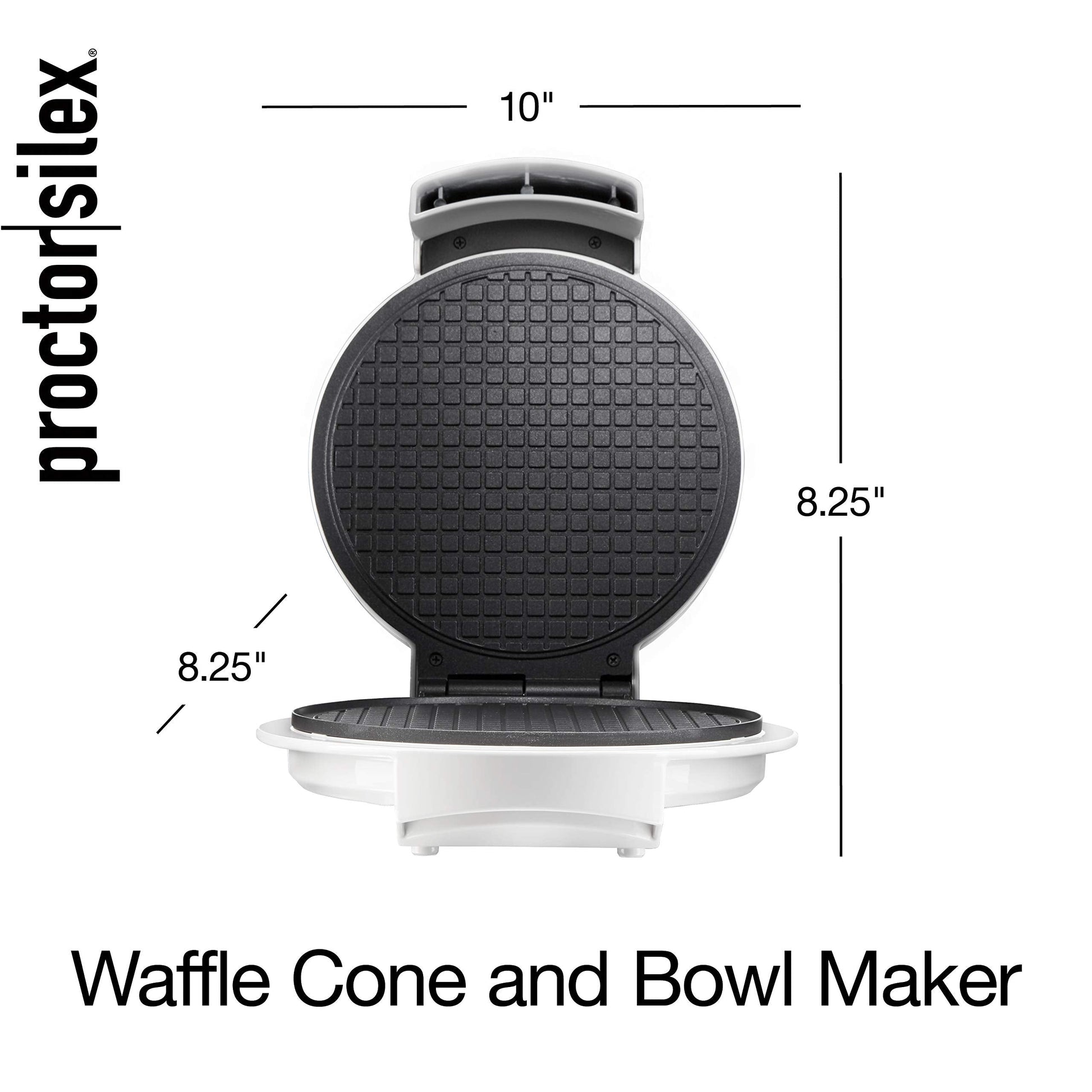 Details: The Proctor Silex Waffle Cone and Ice Cream Bowl Maker makes delicious waffle cones and waffle bowls quickly in 2-3 minutes so there's less wait time Includes waffle bowl press and a cone roller Waffles remove easily from the 7 5” nonstick plates which are easy to clean Stores vertically