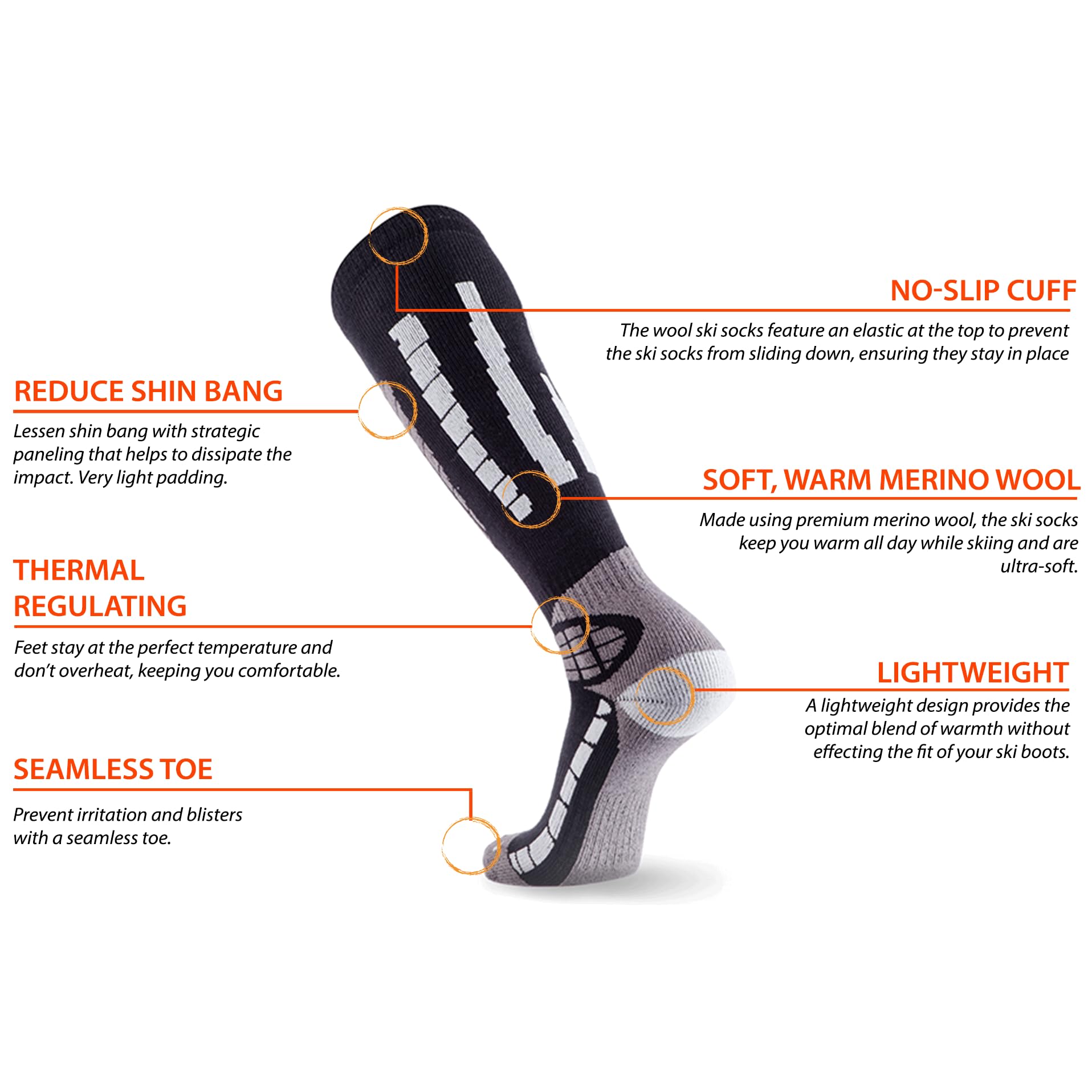Pure Athlete Ski Socks Warm Merino Wool - Best Lightweight Thin Ski Snowboard Sock Women Men (1 Pair - Black/Grey, Large-X-Large)