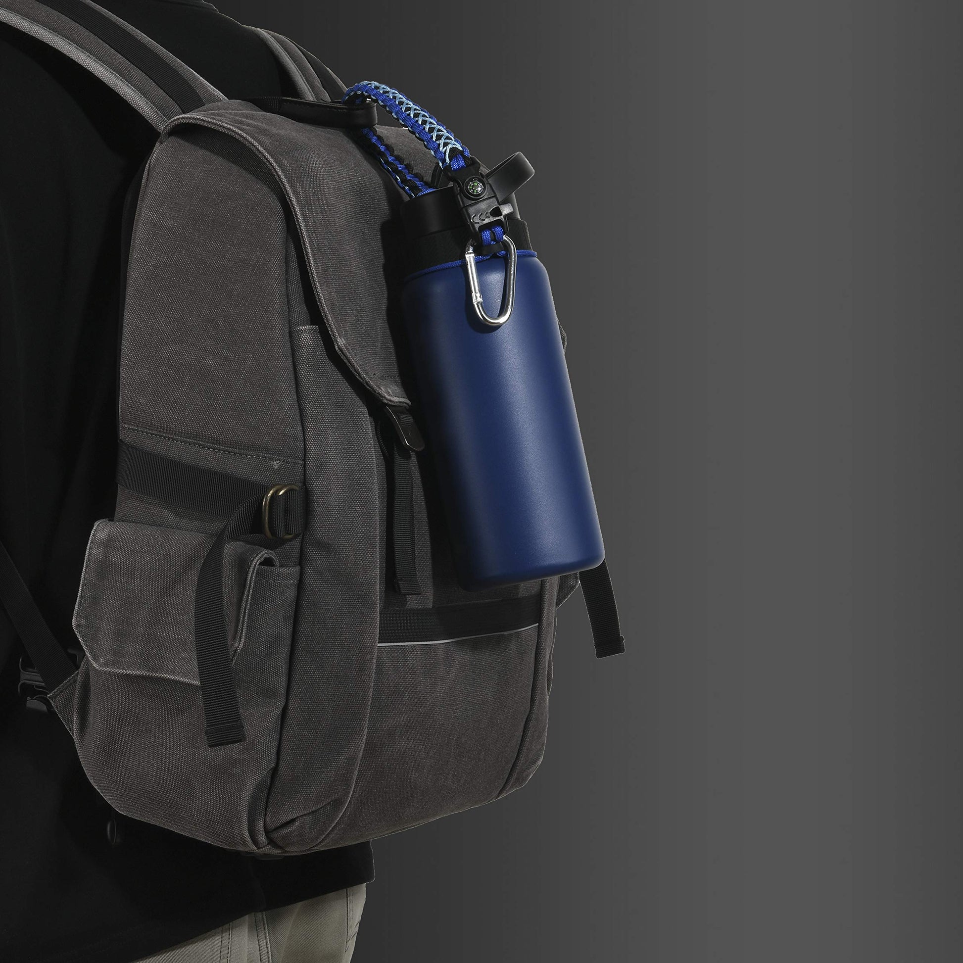 QeeCord 2.0 Paracord Handle for Hydroflask 2.0 Wide & Standard Mouth Water Bottles Strap Carrier with New Safety Ring Holder, 12oz - 64oz (32 oz-40 oz Wide Mouth, Blue/Compass+Whistle+Fire Starter)