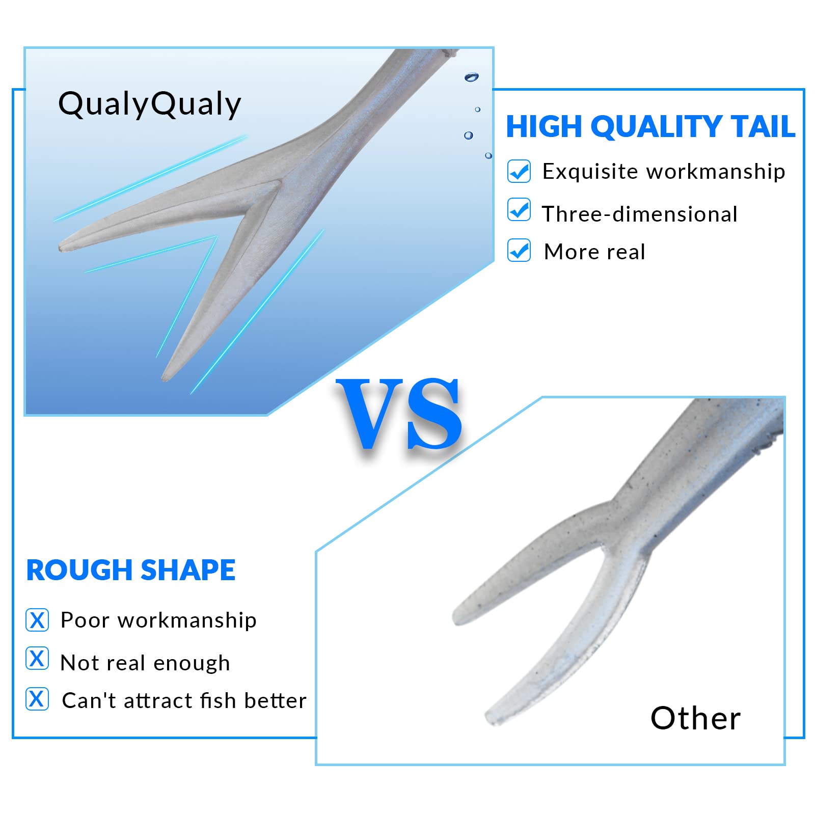 - EXCELLENT ELASTICITY QualyQualy soft fishing lures are durable, reusable and bite resistant, has good elasticity, not easy to be tore by fishes. These shad lures are made of high quality soft plastic, very well made lure as for durability and flexability.