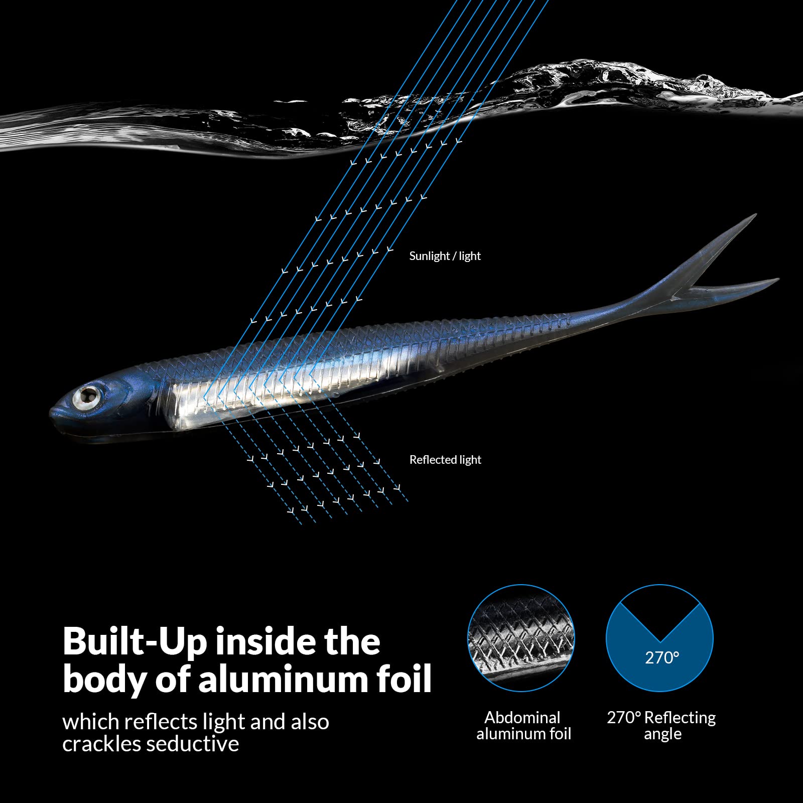 This shad lure with ultra realistic details, include highly detailed fish scale pattern, with flash foil in the belly to provide reflection under the water which is good on the days when you need that flash, thus will more attract bites.