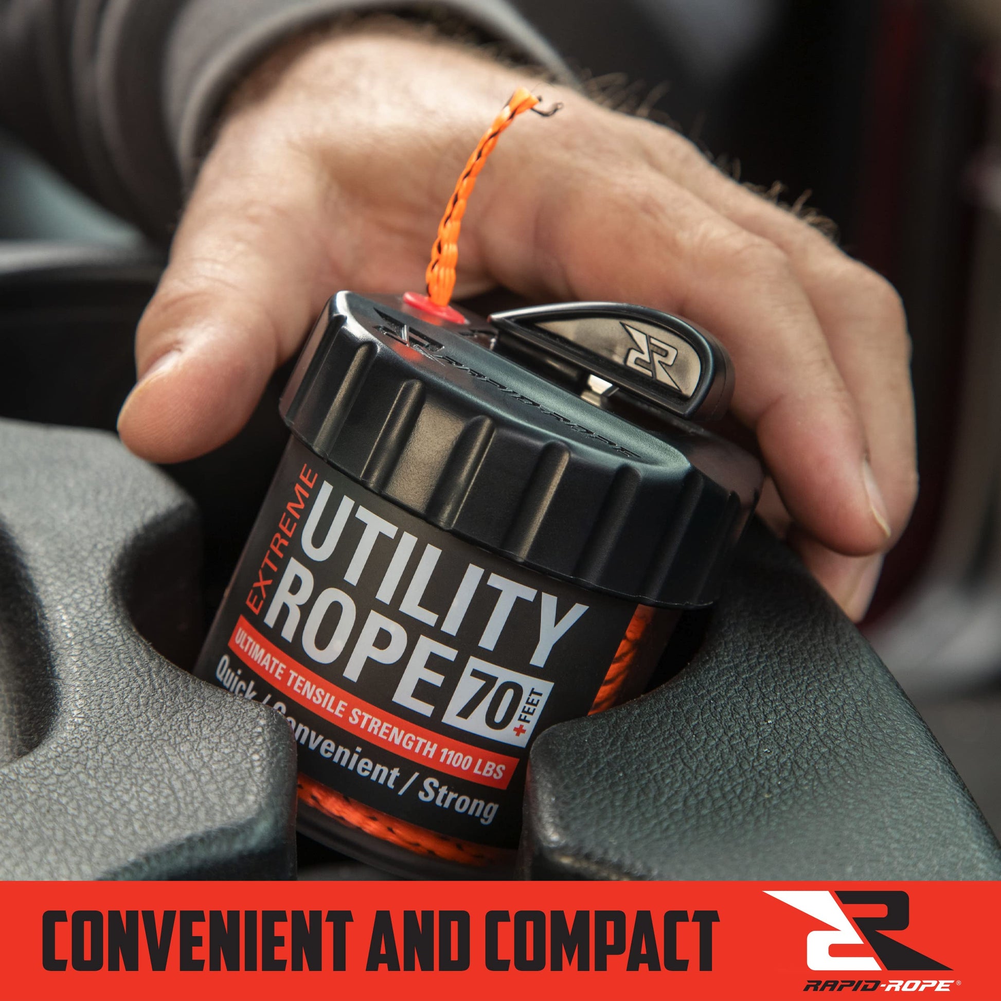 - FLAT TACTICAL PARACORD: 1100 pounds of tensile strength can hold just about anything! The rope itself is flat and braided. It fits into a convenient canister that is about the same width, and slightly taller than a 12oz soda can. This product has a patented built in cutter attached to the top of the canister. This keeps your fingers safe, and provides an easy way to cut the cord. Rapid Rope can easily fit in a cup holder, survival bag, hiking gear, fishing equipment and general use.