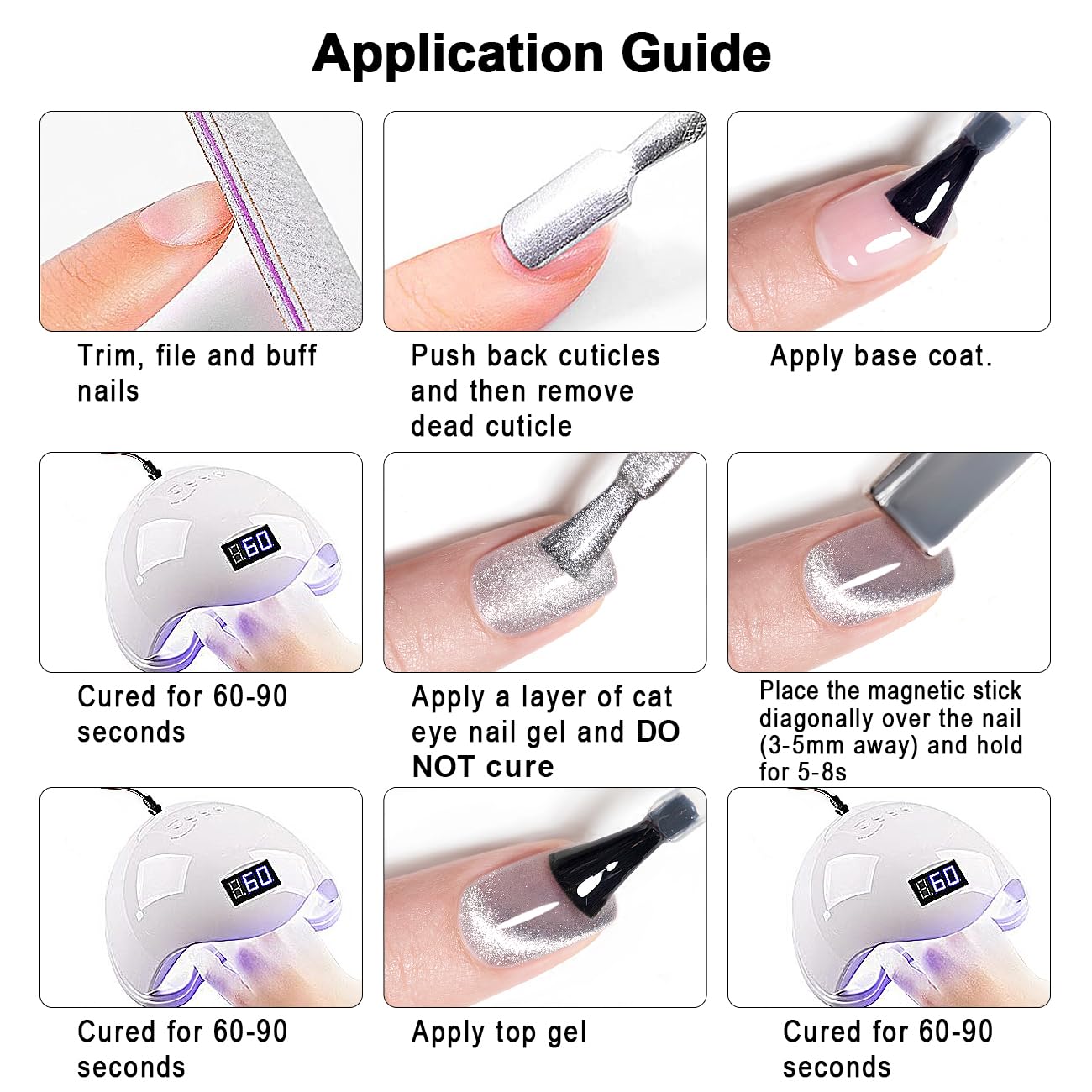 - HOME SALON QUALITY:Diamond cat eye gel nail polish is good choice for a nail salon or nail starter at home.You can design your own manicure at home to show your style. Remember the gel polish needs to be cured under LED or UV nail lamp. Average for Nail Lamp 60-120 secs
