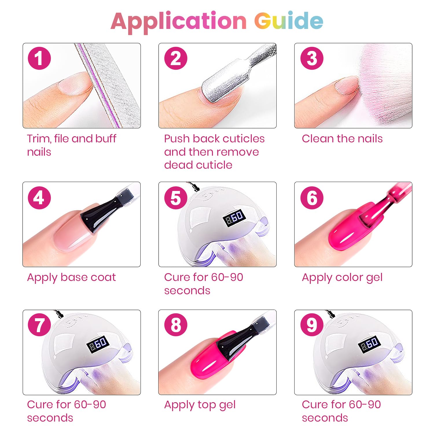 - EASY TO APPLY:This gel polish set is made with natural resin formula, so this gel polish set won't cause smudges cracks or chips.The colors cure quickly under UV/LED lights.It can last for 21+ days with perfect shine under the proper application