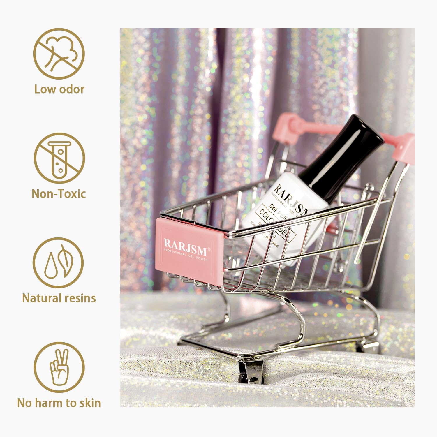 - RESIN FORMULA:RARJSM platinum glitter nail gel polish is made of natural resin, non-toxic formula.It’s a highly-pigmented, long-lasting polish that won’t chip or smudge.No harsh ingredients or adhesives with low smell, rich color, middle consistency, self-evenly, no shrink and edge