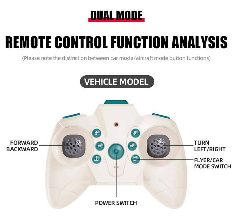 - 【2 Mode Contro】Easily transition between car and drone modes with the 2.4G remote control. In car mode, the throttle controls forward and reverse, while the steering wheel handles left and right turns. In flight mode, the controls adapt for ascent, descent, and directional flight.