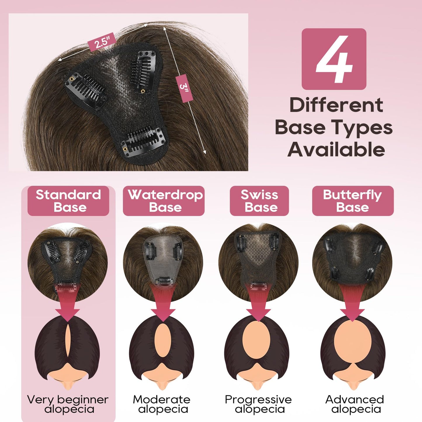 - ➤【AVAILABLE IN 4 SIZE BASE TYPES】- With 4 different hand-tied hair topper base types, REECHO 10 inch human hair topper offers you with different coverage for handle every stage of hair loss that you are experiencing. The breathable and lightweight hair toppers for women designed to elevate your hair-wearing experience.