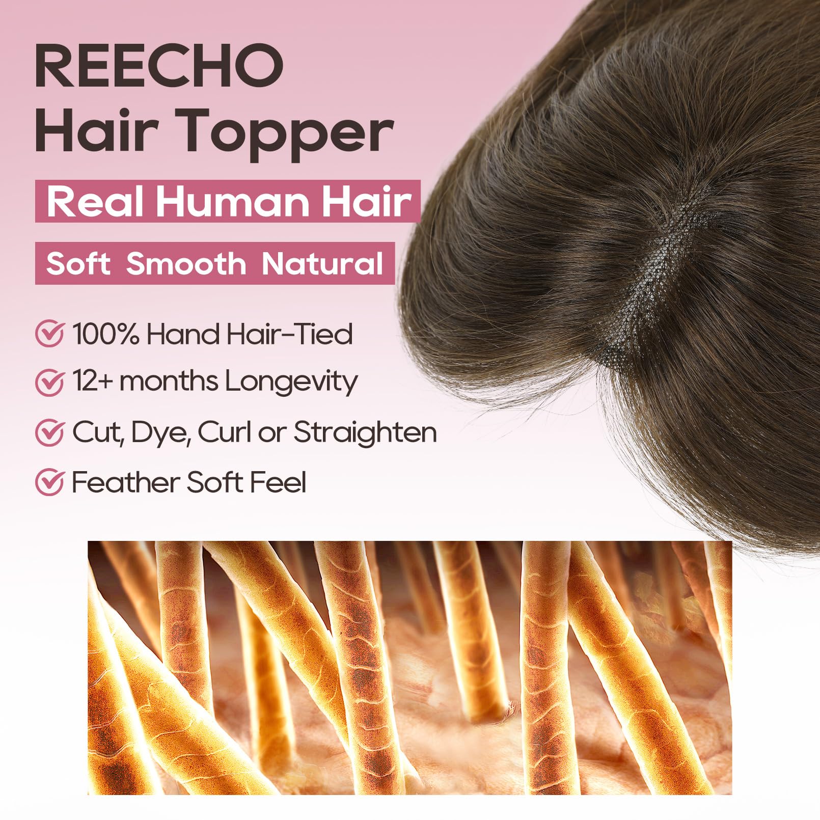 - ➤【SAY GOODBYE TO ALL HAIR PROBLEMS】- REECHO human hair topper is perfect solution for people with hair loss, and wishes to cover up thinning areas or baldness on the scalp, whether you're experiencing hair loss or seeking a convenient way to add volume and coverage. Discover the freedom of various sized part and embrace a renewed sense of confidence and style.