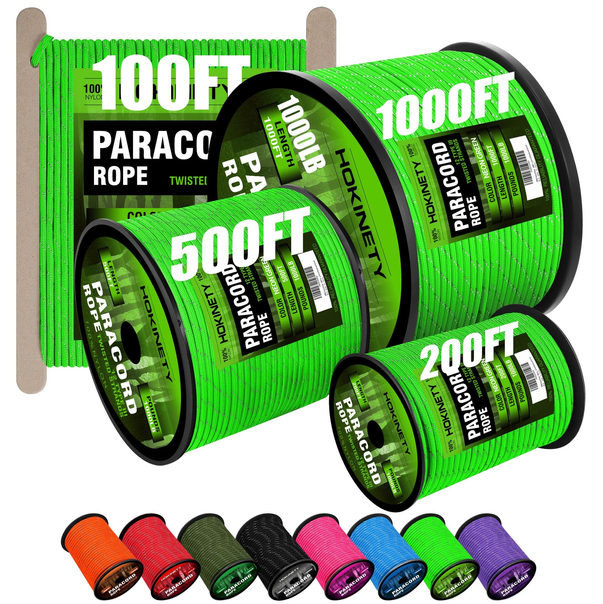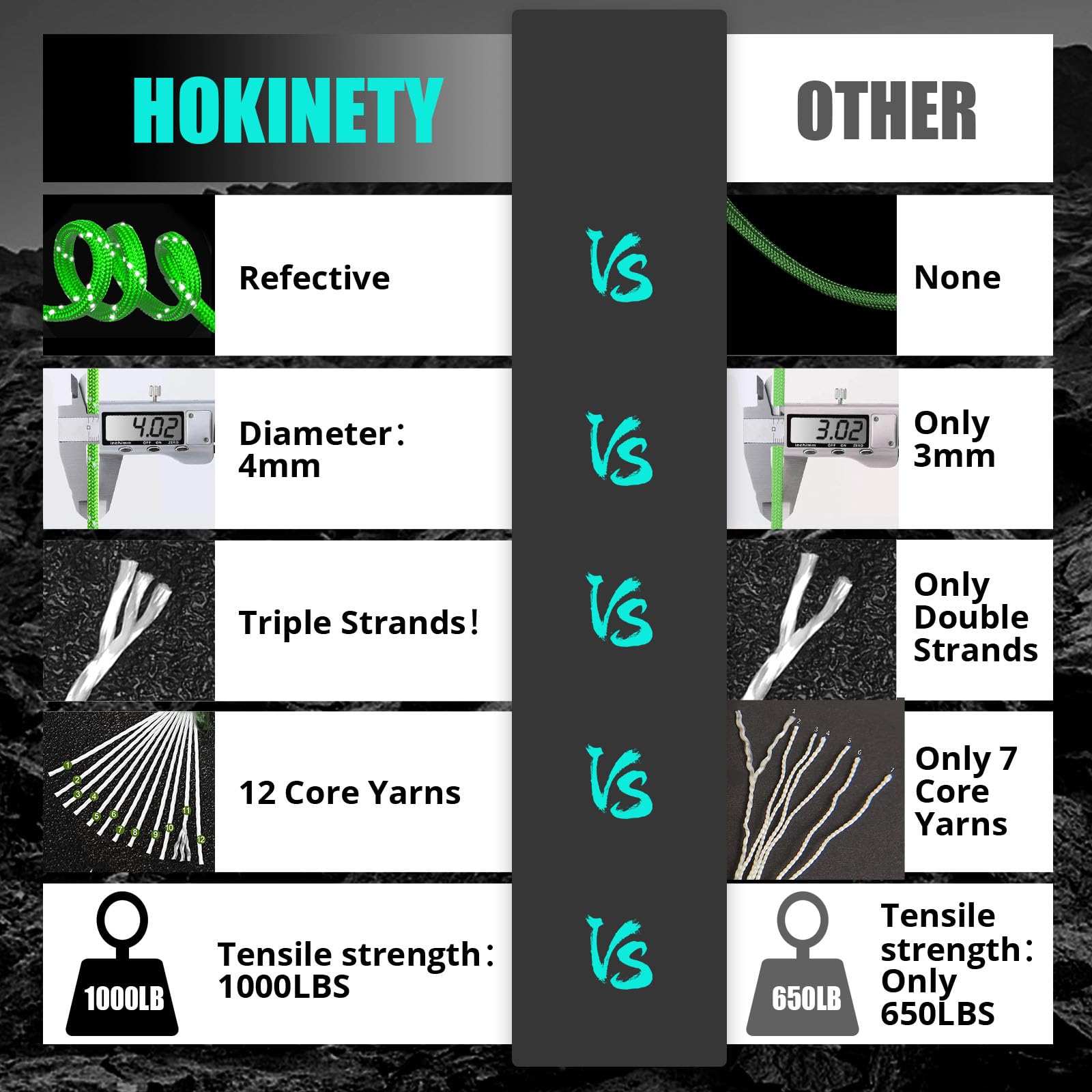 - 550 LBS UPGRADE TO 1000 LBS: Featuring an abrasion-resistant 32-wire sheath and a 12-strand inner core. Our parachute rope is rigorously tested and rated with a minimum breaking force of 1000 pounds, providing an additional 250 pounds of resistance compared to the standard 750-pound parachute rope. Thickness of 4 mm. Explore our HOKINETY reflective parachute kit now