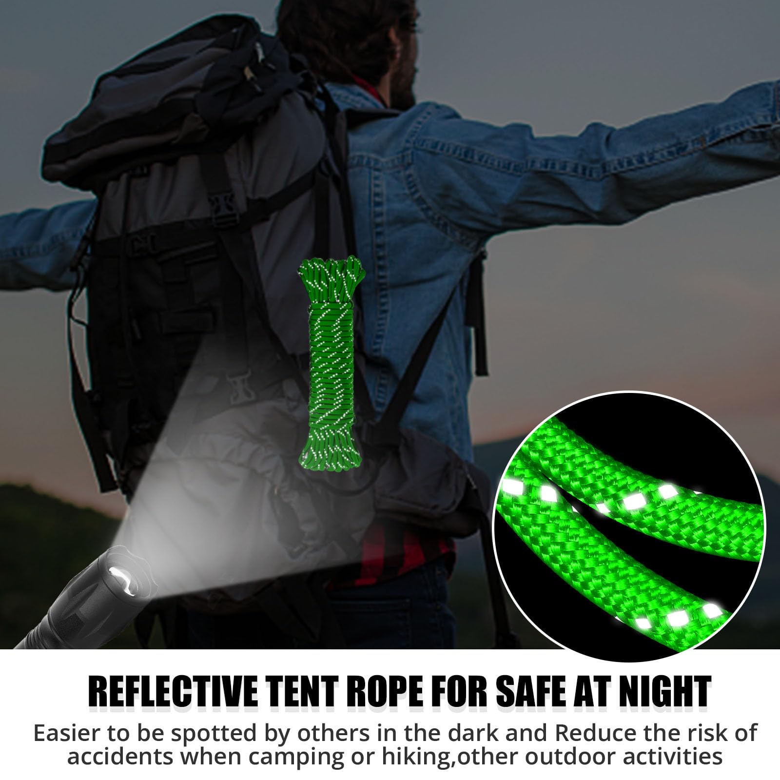 - NOVELTY REFLECTIVE STRIPS FOR NIGHT SAFETY - Under the illumination of flashlights, car lights, lanterns and even moonlight, the strips exhibits a reflective effect ensuring high visibility. Wrapping the camping rope around the tent at night effectively prevents tripping hazard and increase safety. This paracord is still a professional-grade parachute cord, no need for concern about accidents anymore