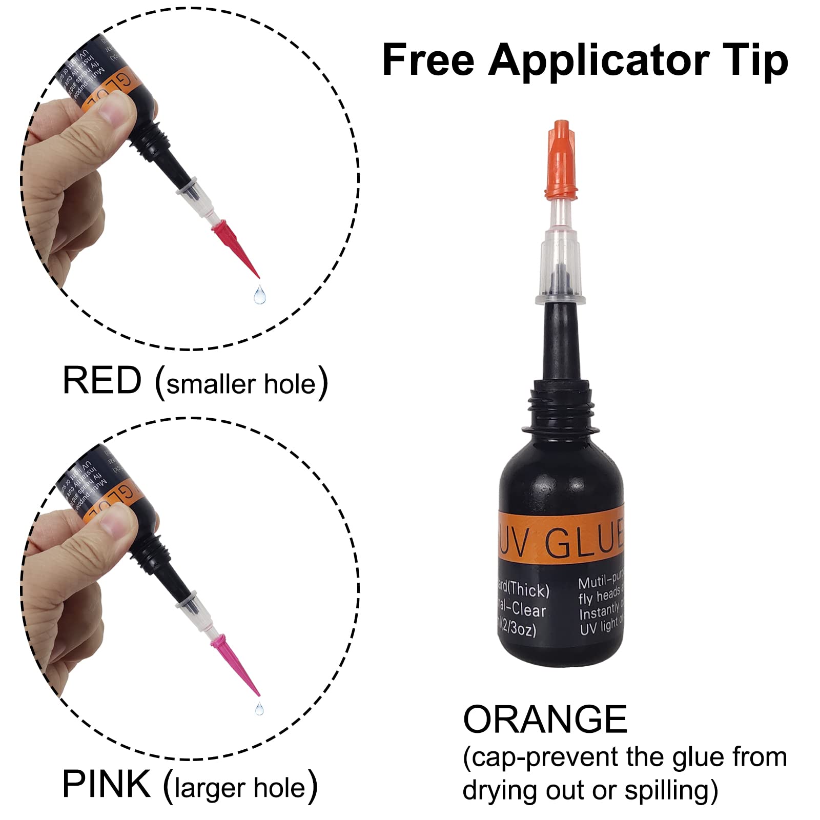 - Flew uv glue ready to use, no need any preparation. This super power flex UV glue will make vivid flies moving super realistic. They are also the best protection for all type knots. Customer can use the dubbing needle open the bottleneck.Cure in seconds under UV light, crystal clear and glass smooth. Stay clear and never turns yellow and also super durable comparing traditional epoxy. 100% Tack-free. Both of them are multi-purpose, instantly cure with light or sunlight.