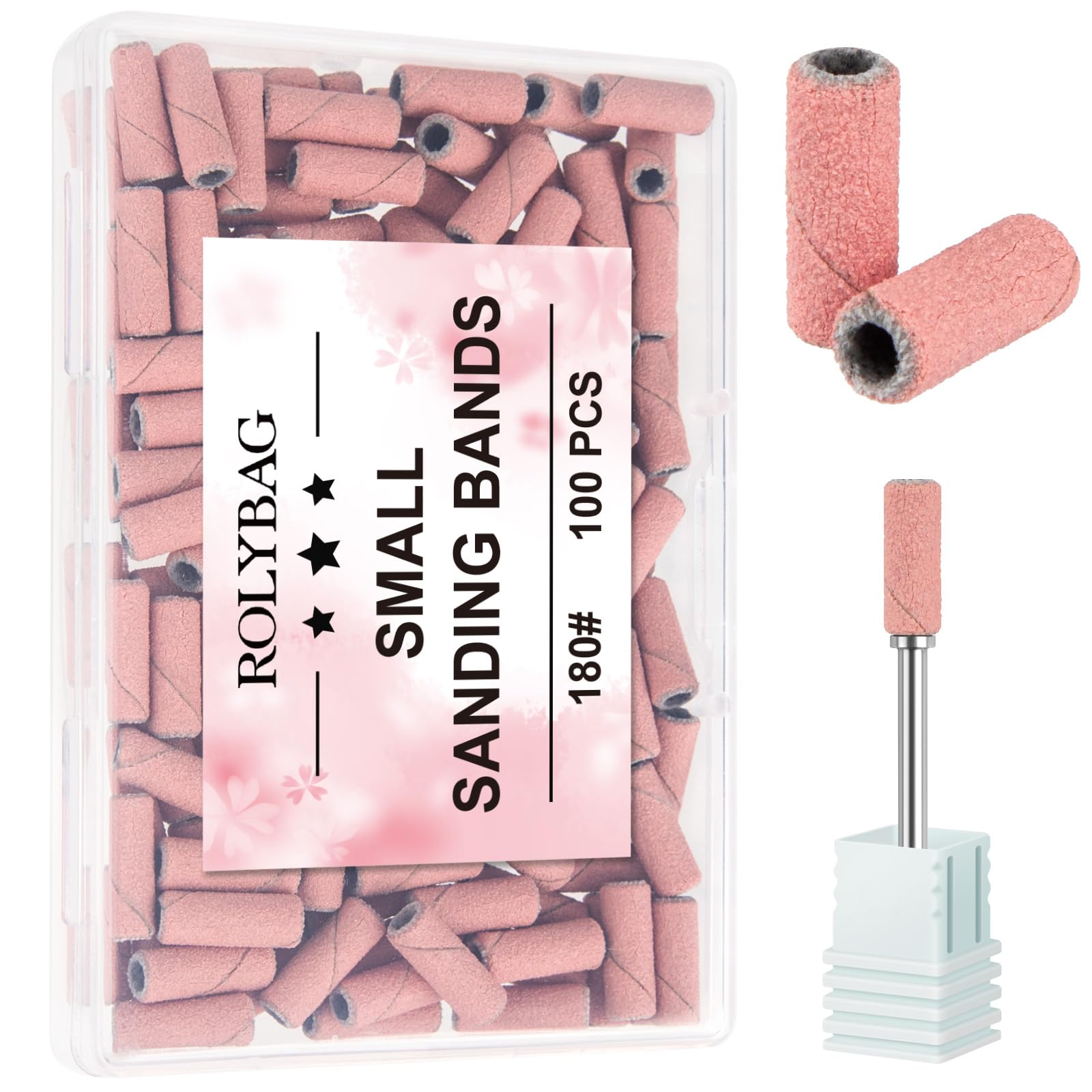 Rolybag 100pcs Small Sanding Bands Nail Drill Bits 180 Fine Grit Nail File Sanding Bands with 3.1mm Mandrel Bit for Acrylic Nails Gel Removing Shaping Professional Manicures and Pedicure, Pink