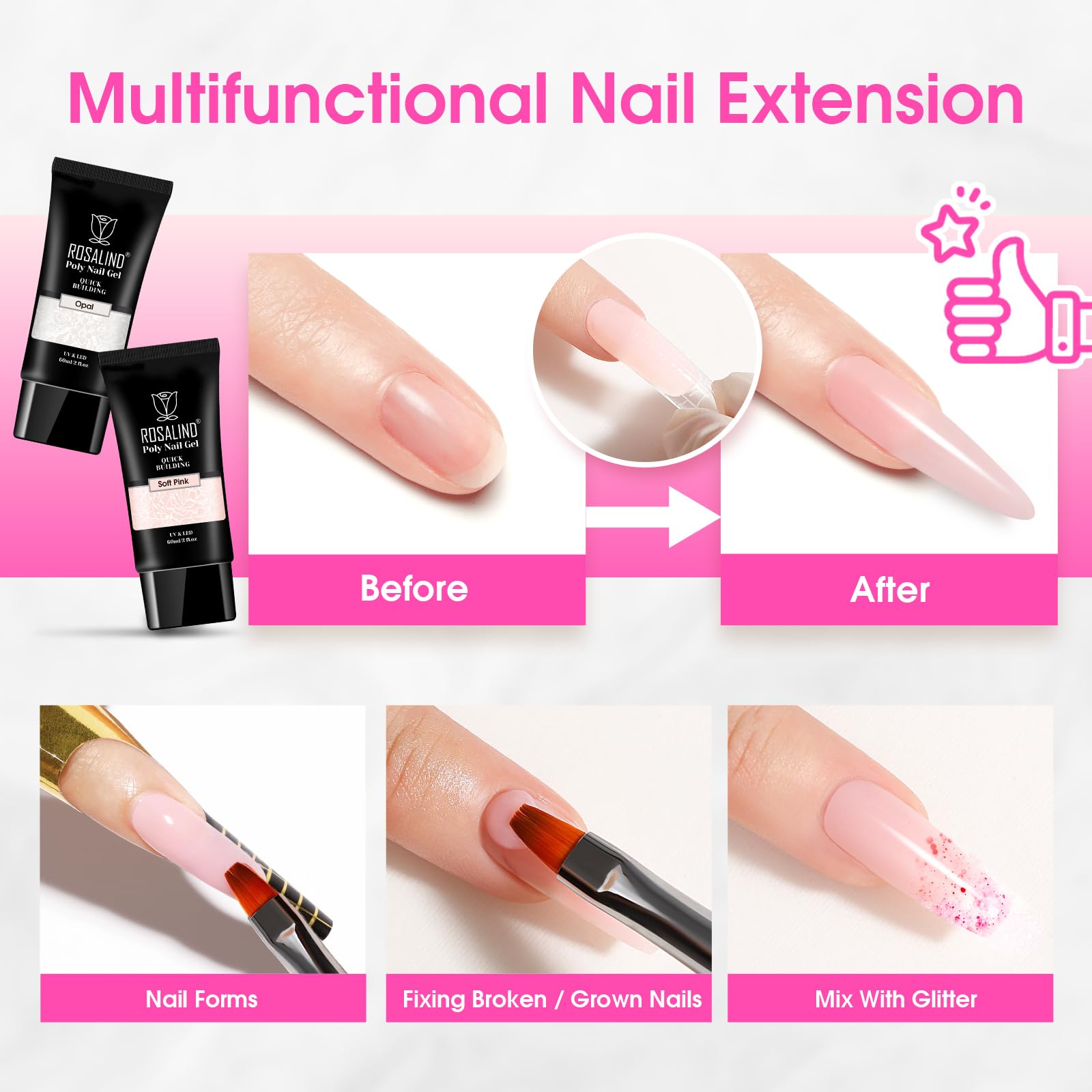 - FAST AND EASY: ROSALIND pink and clear poly nail gel stronger, more flexible, easier to control than other nail extension gel products. It's lighter than acrylic gel. When you do the nails, it seems like you never wear any gel on your nails. It makes your nails look charming, with pretty length and neatness. No chips or smudges.
