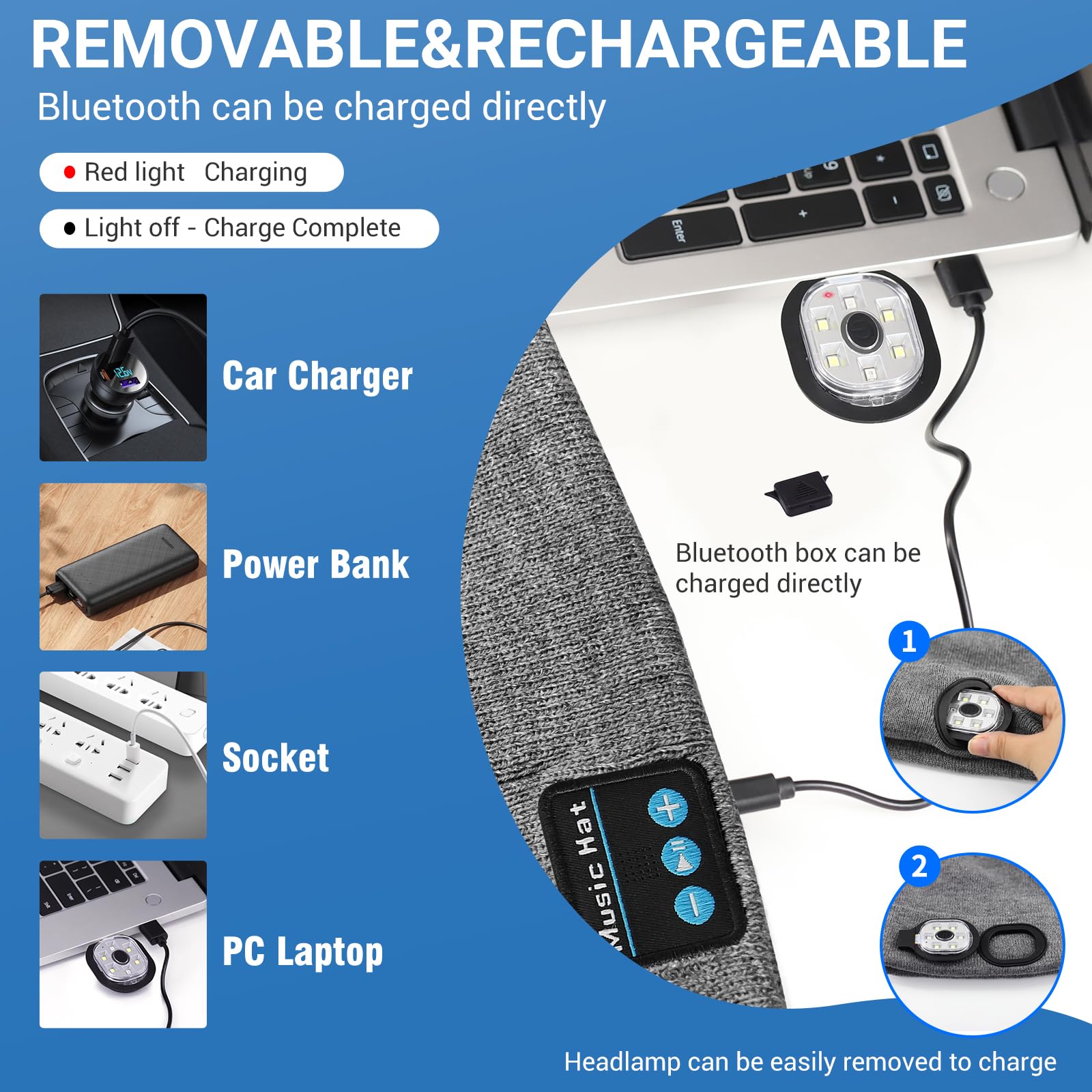 Rotibox Bluetooth Beanie with Light, Unisex USB Rechargeable 4 LED Headlamp Hat, Wireless Headphones Grey