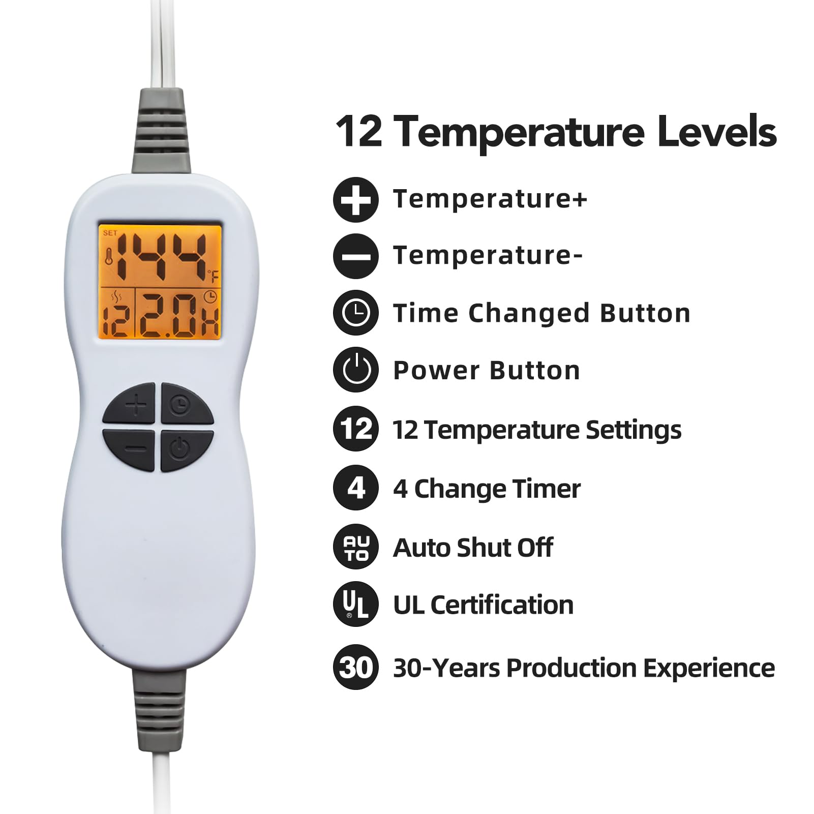 - Fast-Heating Technology &12 Temperature Settings: The heating coil length is 150% of the ordinary heating pad, Ambershine heating pad warms up just in few seconds, To better meet your needs, this heating pad is designed with 12 temperature Settings (104℉ ~ 144℉) and 4 auto-off countdown timers (0.5H, 1H, 1.5H, 2H), After setting, the LED screen will show the time left in the countdown.