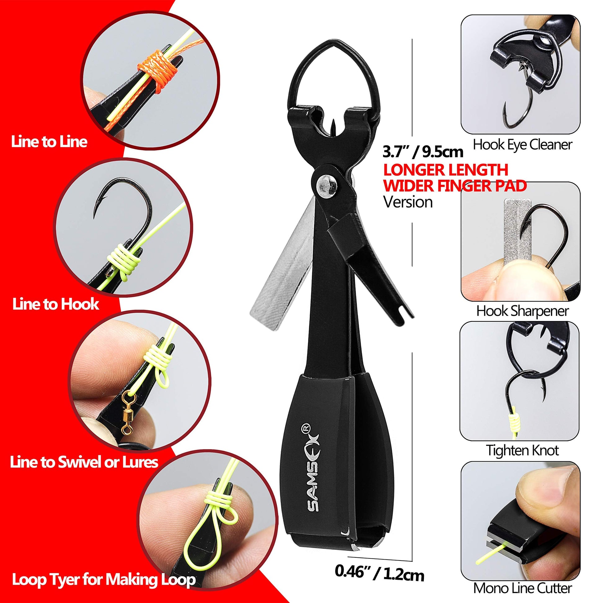 Complete with the quick knot fork, line clipper, eye cleaner, hook sharpener, and D-ring