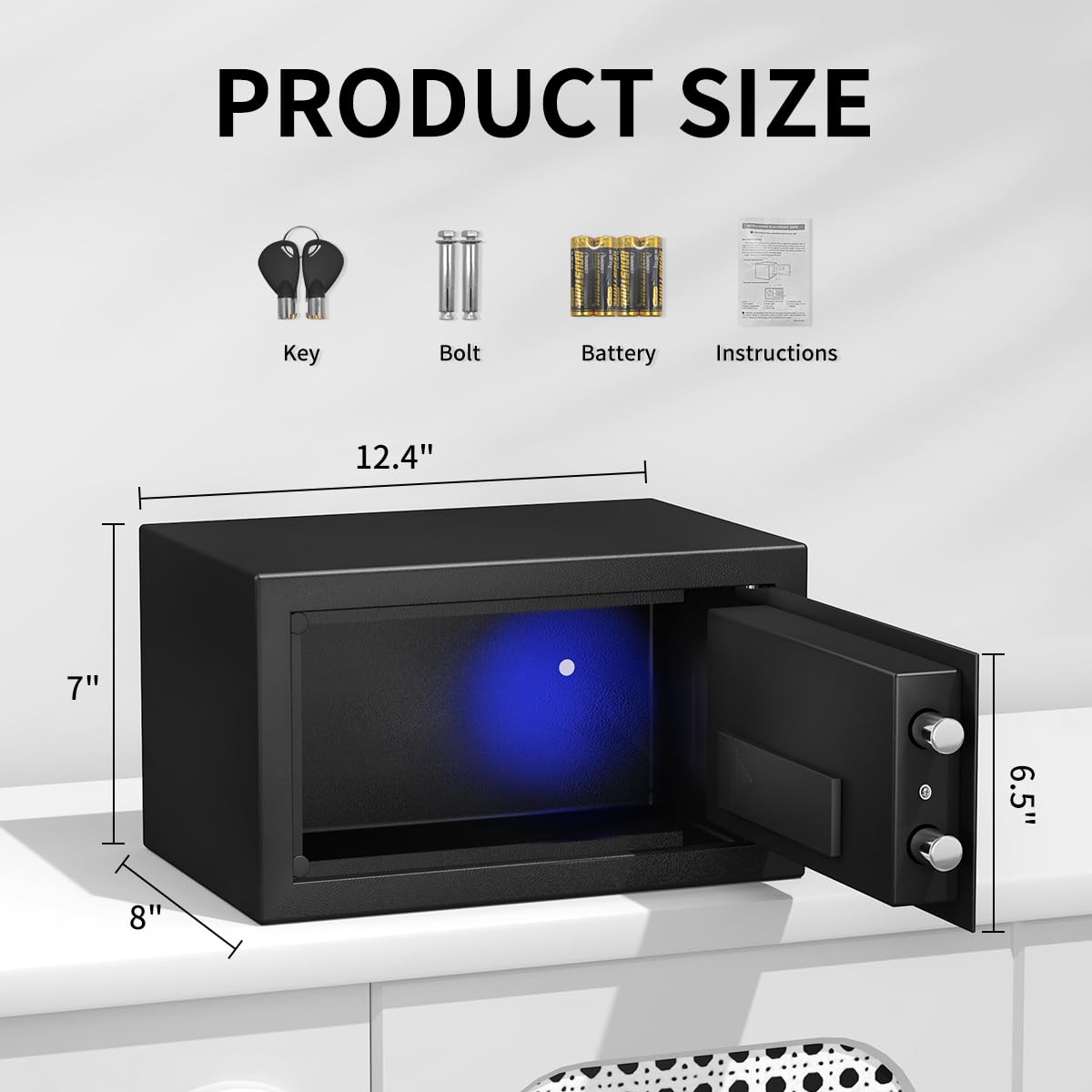 - 【Meet your needs】The outer size of the smart safe: 12.4' x 8' x 7', the inner size of the safe box : 11.9' x 7.5' x 6.5'. Capacity: 0.4 cubic feet. This money safe box with suitable size can safely store your cash, jewelry, documents, watches,passports, certificates,heirlooms or other important items.