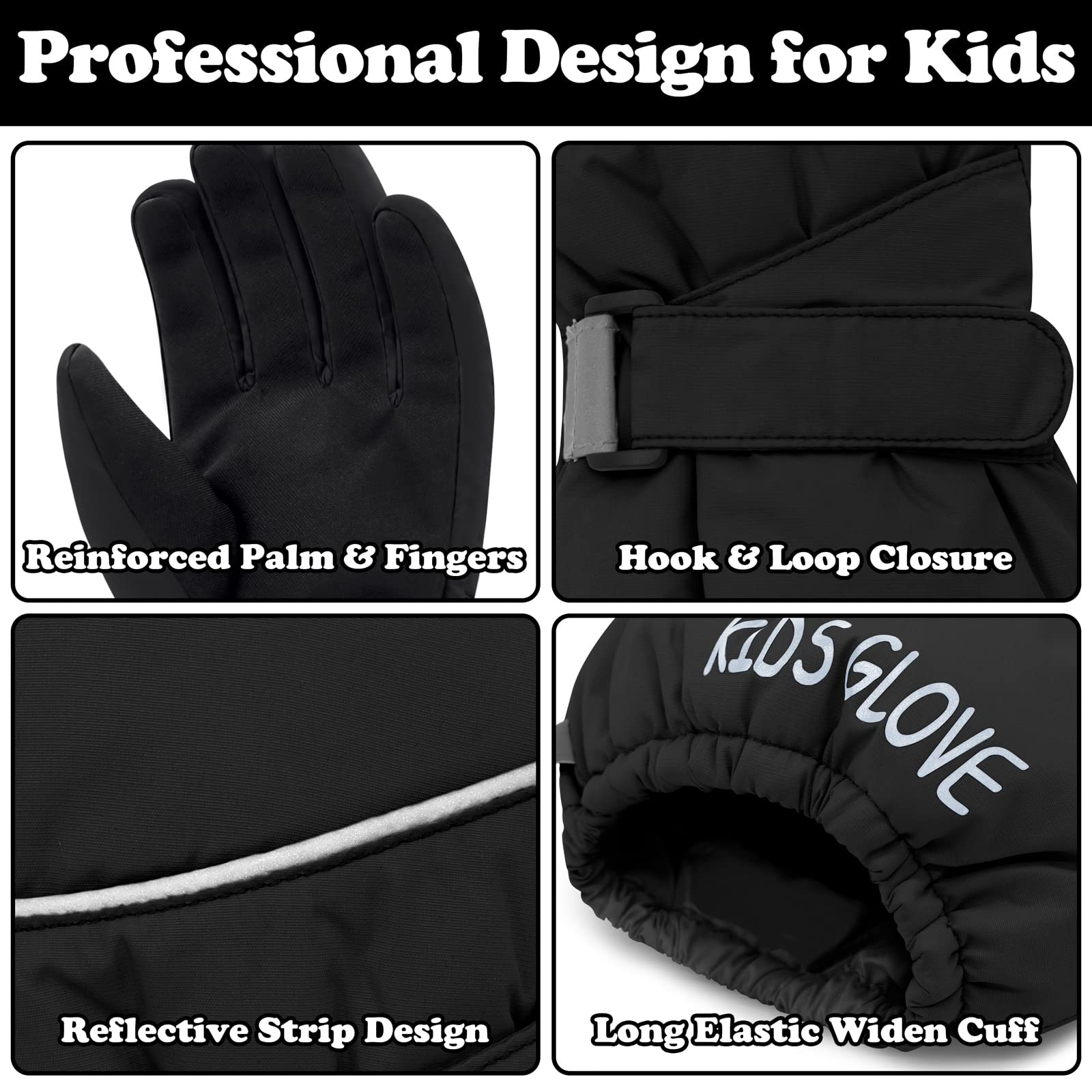 - ANTI-SLIP PALM & REFLECTIVE DESIGN: The durable oxford reinforced palm makes our kids ski gloves have good tear resistance and wear resistance, effectively preventing slipping. And the reflective stripes design of our kids waterproof gloves provides safety for for children's outdoor and night activities. In addition, each pair of kids gloves is equipped with a lock clip, which makes it easy to snap the toddler ski gloves together to avoid loosing them.