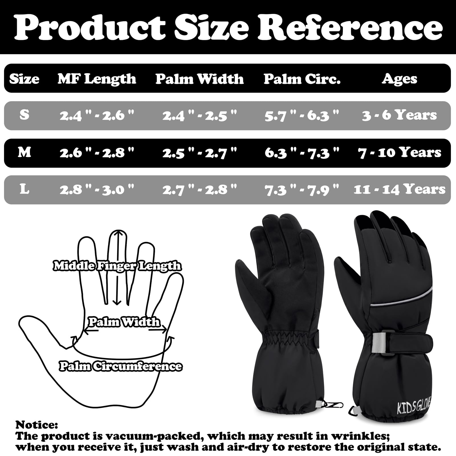 - SIZE INFORMATION: Our boys snow gloves and girls winter gloves have 3 sizes with different classic colors. Size S is recommended for 3-6 Years, Size M is recommended for 7-10 Years and Size L is recommended for 11-14 Years. Please choose according to child's actual plam size, finger length and size chart. And in addition to winter outdoor activities, these ski gloves for kids are ideal for Christmas, New Year, Birthday and so on!
