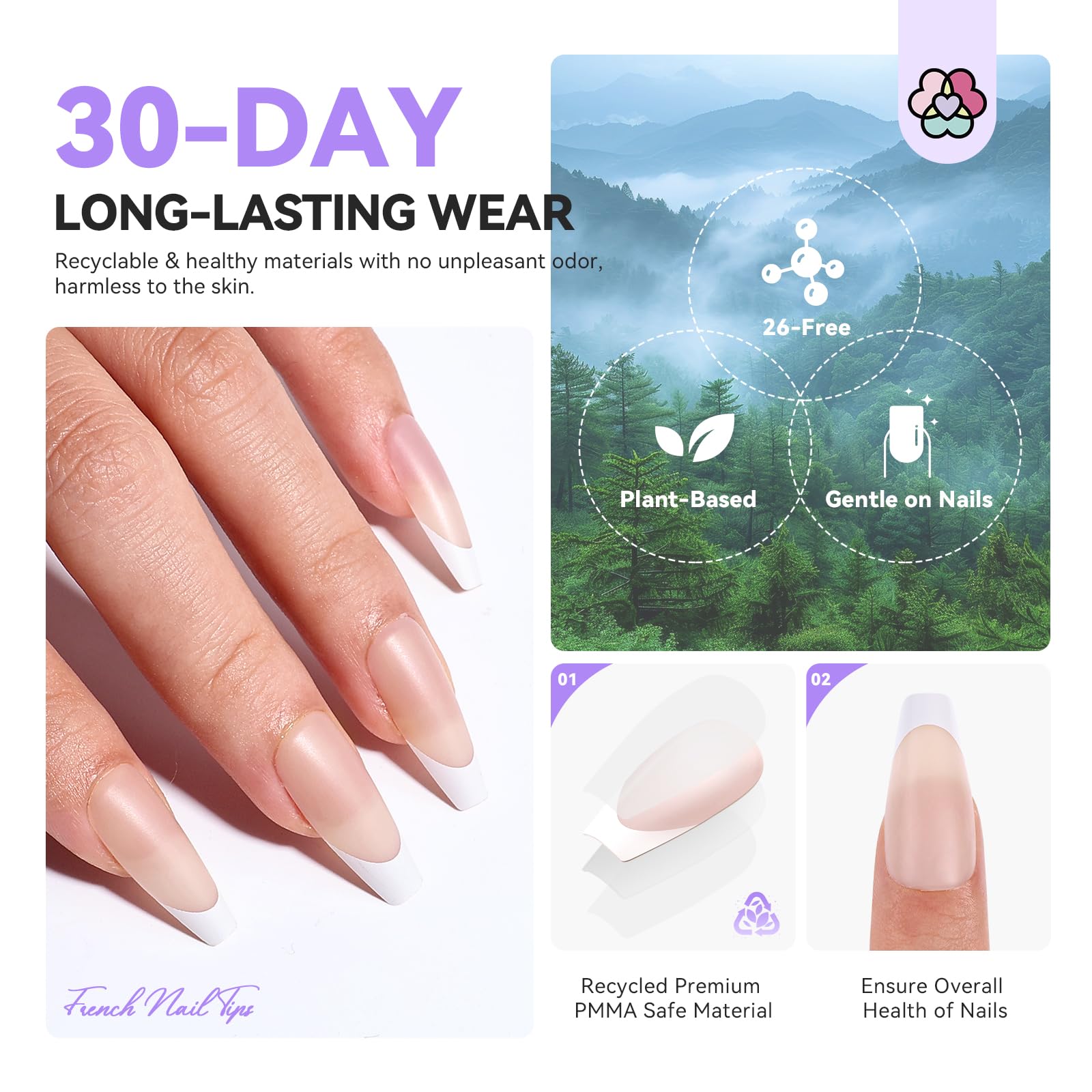 SAVILAND French Tip Press On Nails: Long Coffin Thicker & Sturdy Acrylic Press On Nails 150 PCS Long-lasting Nude French Tip Nails Natural Look Fake Nails Soft Gel Nail Tips DIY Fast Home Manicure