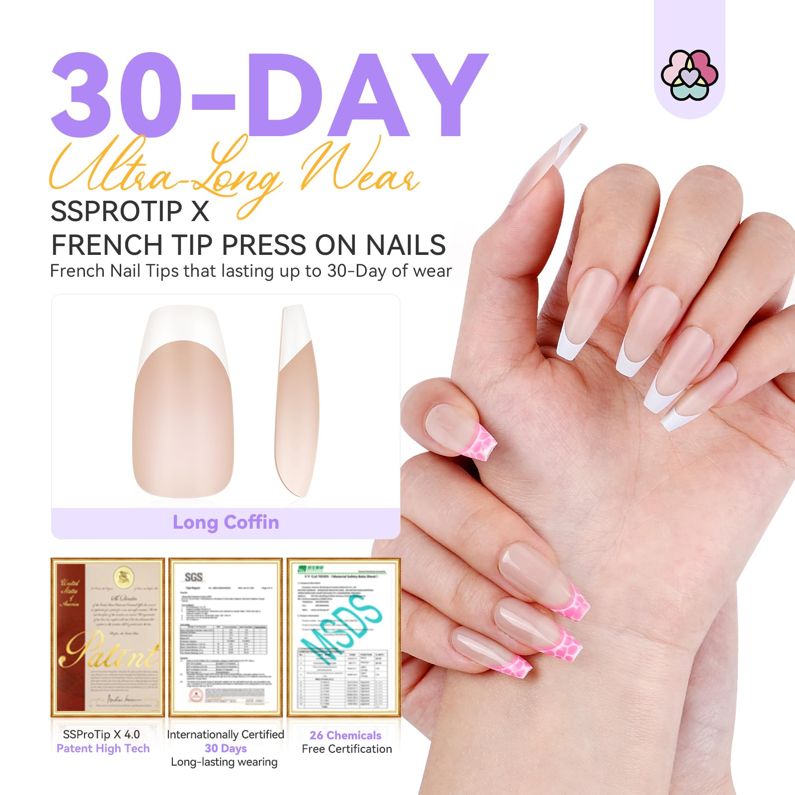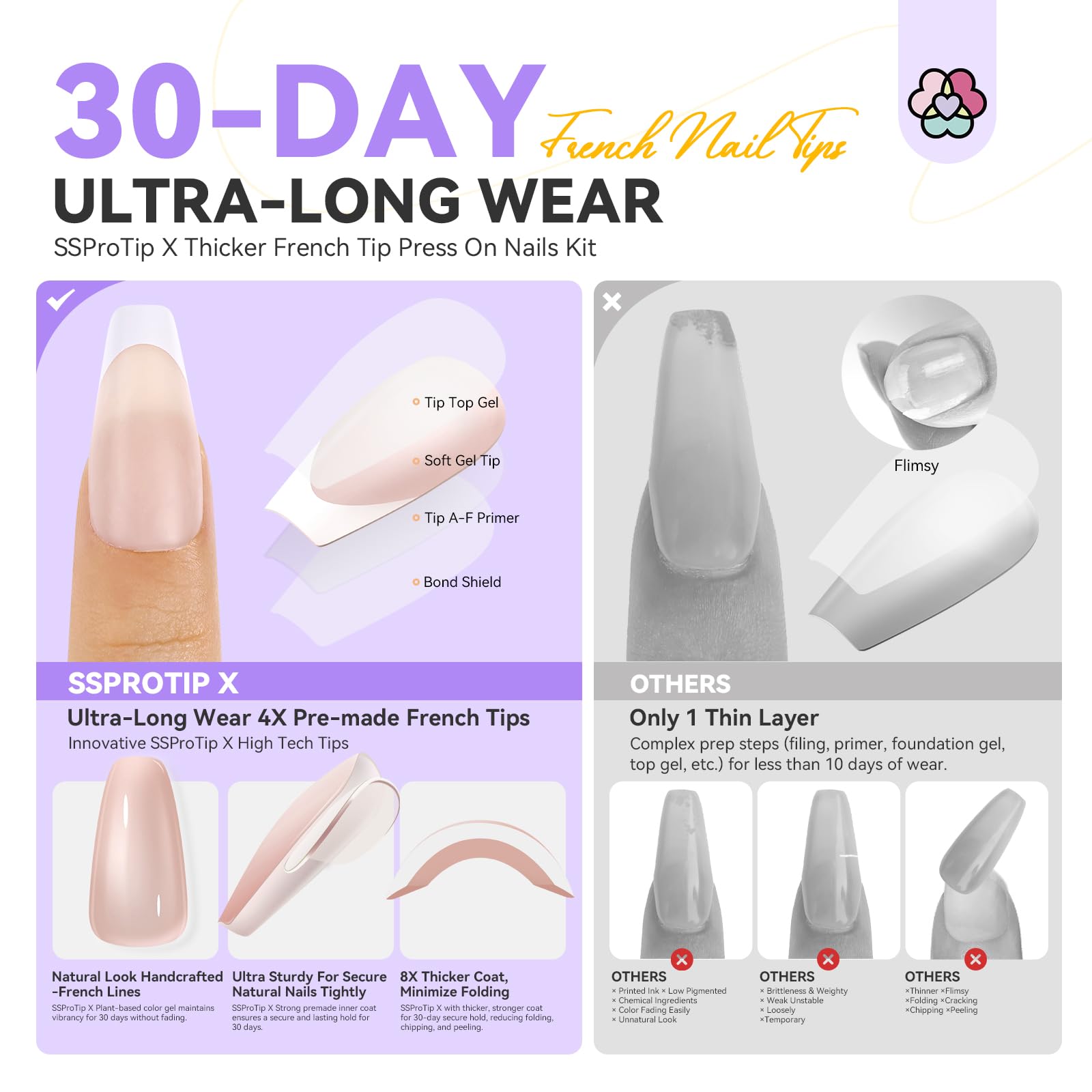 - Long-lasting French Tip Press on Nails: Say goodbye to peeling and cracking of nails. SAVILAND press on nails for women French Tip features 4X premade coat (combining Tip Top Gel, Soft Gel Tip, Tip A-F Primer, Bond Shield) to improve durability and provide longer lifespan of more than 30 days