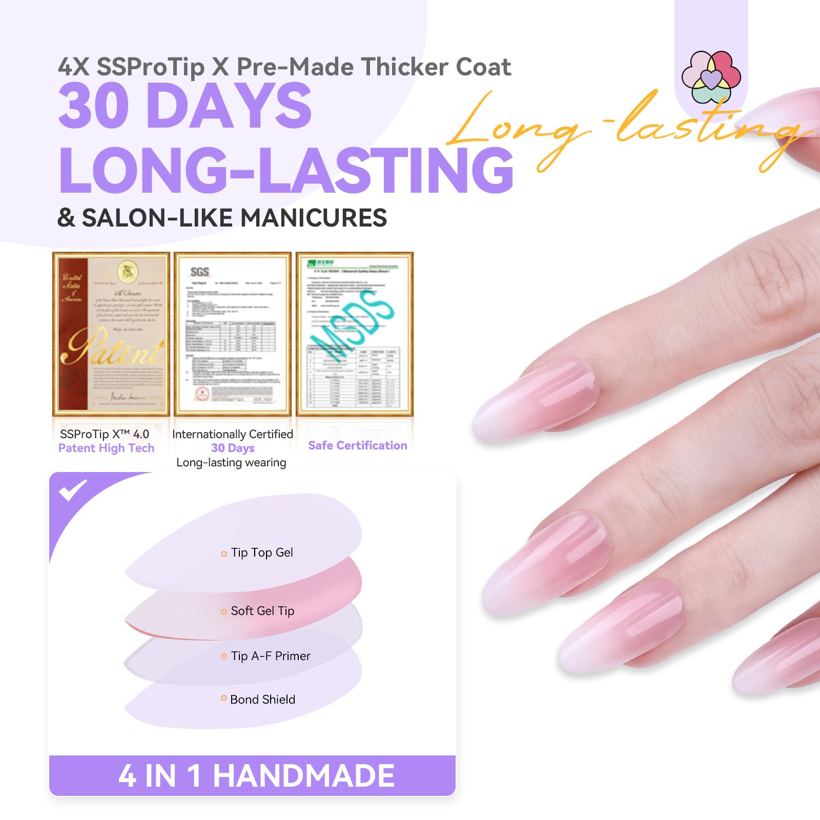 - 30 Days of Flawless Beauty: Experience up to 30 days of stunning nails with Almond Nail Tips! Reinforced with a thick rear edge and 4-Layer Coating (Top Gel, Soft Gel Tip, Primer & Bond Shield), these French tips are designed for durability, making them perfect for long wear without chips or cracks